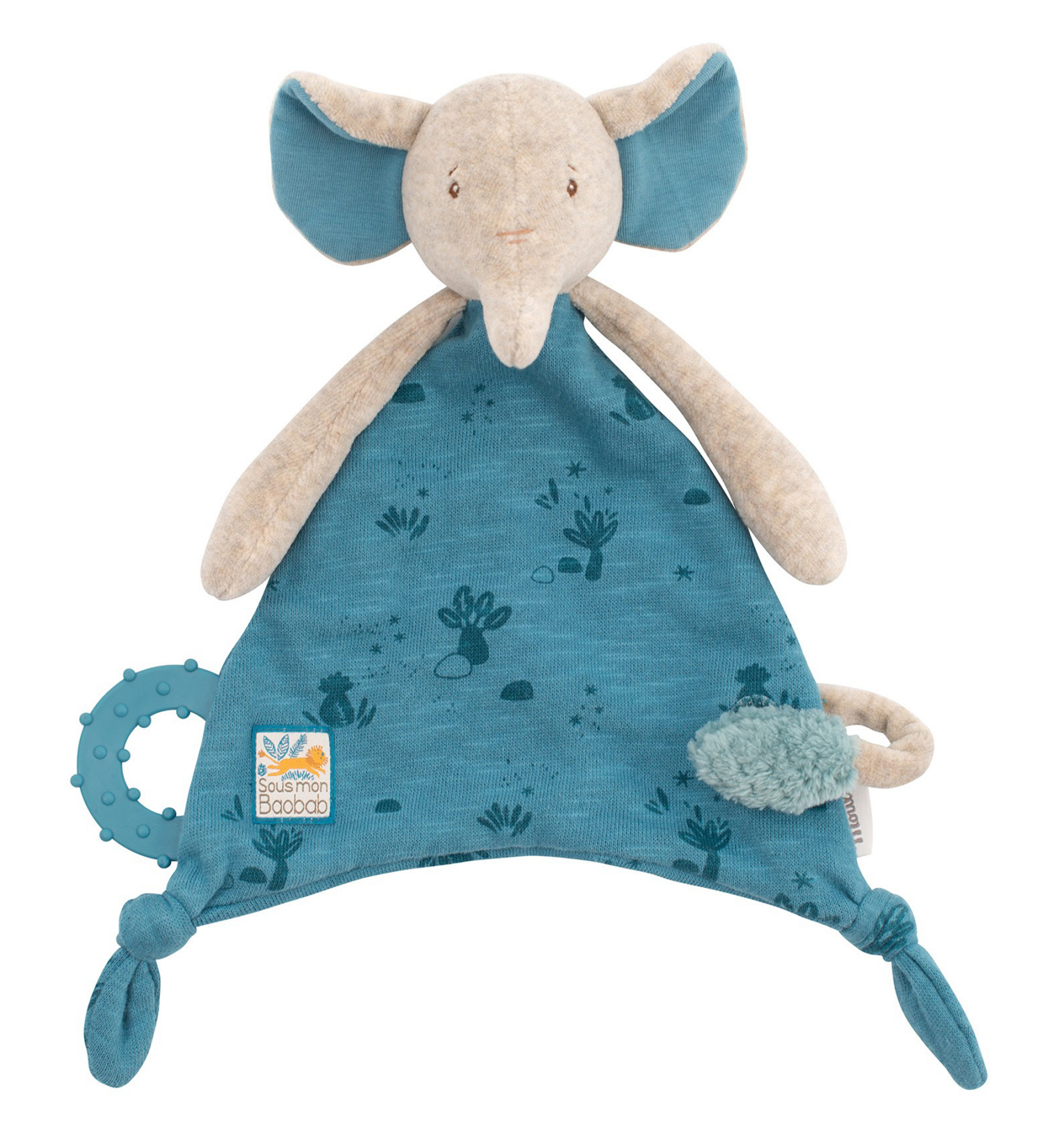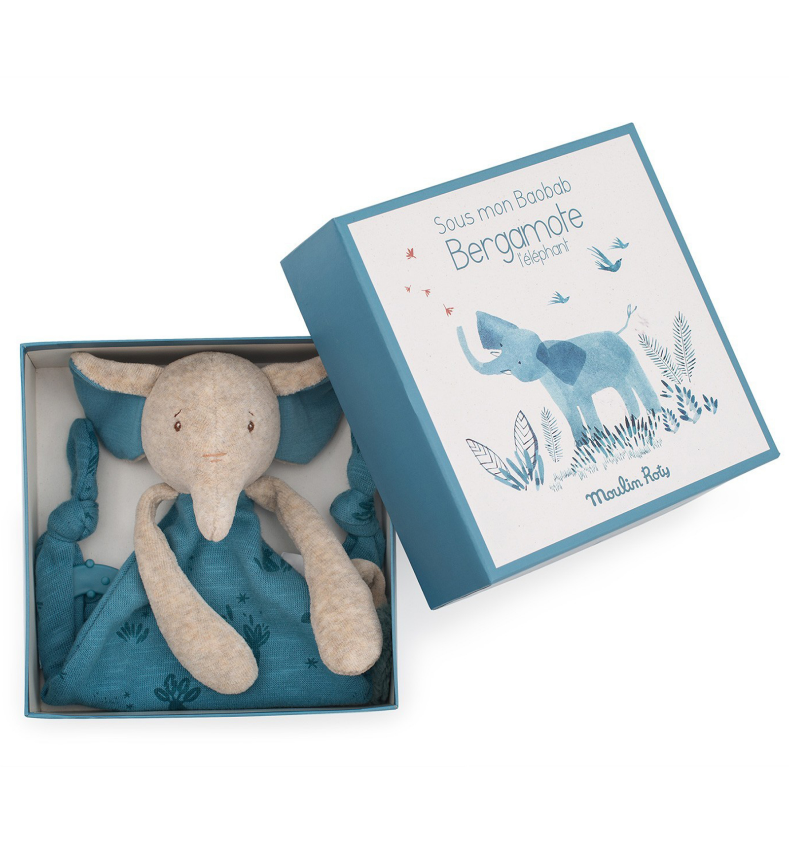 El elefante Bergamote de Moulin Roty es doudou, mordedor y porta chupete. Como doudou, acompañará a tu bebé a la hora de calmarse o de dormir; como mordedor, aliviará los dolores de la dentición; y como porta chupetes, permite colgar el chupete para no perderlo. Desde el nacimiento.