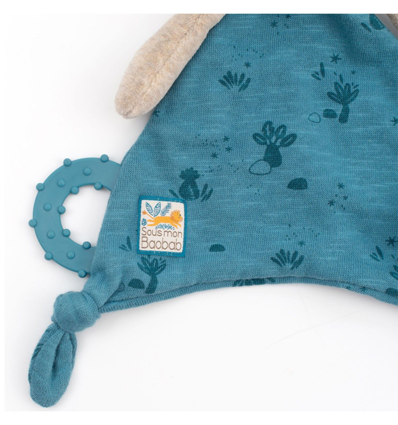 Un suave doudou con un mordedor para cuando empiecen a salirle los dientes a tu bebé, con una colita donde enganchar el chupete, con nudos para que el bebé agarre fácilmente el muñeco,...