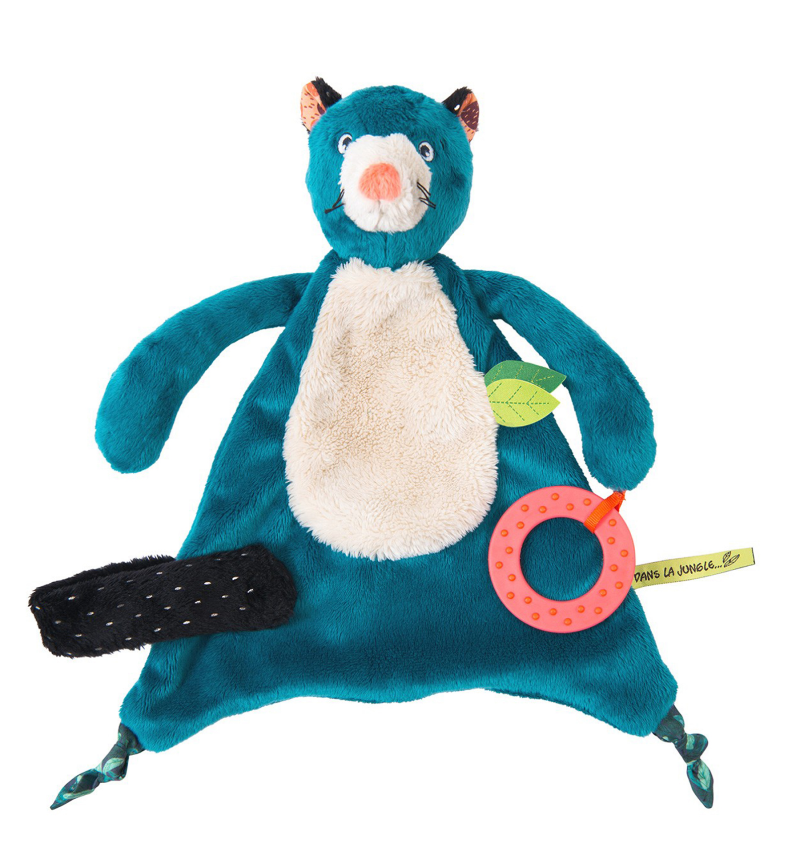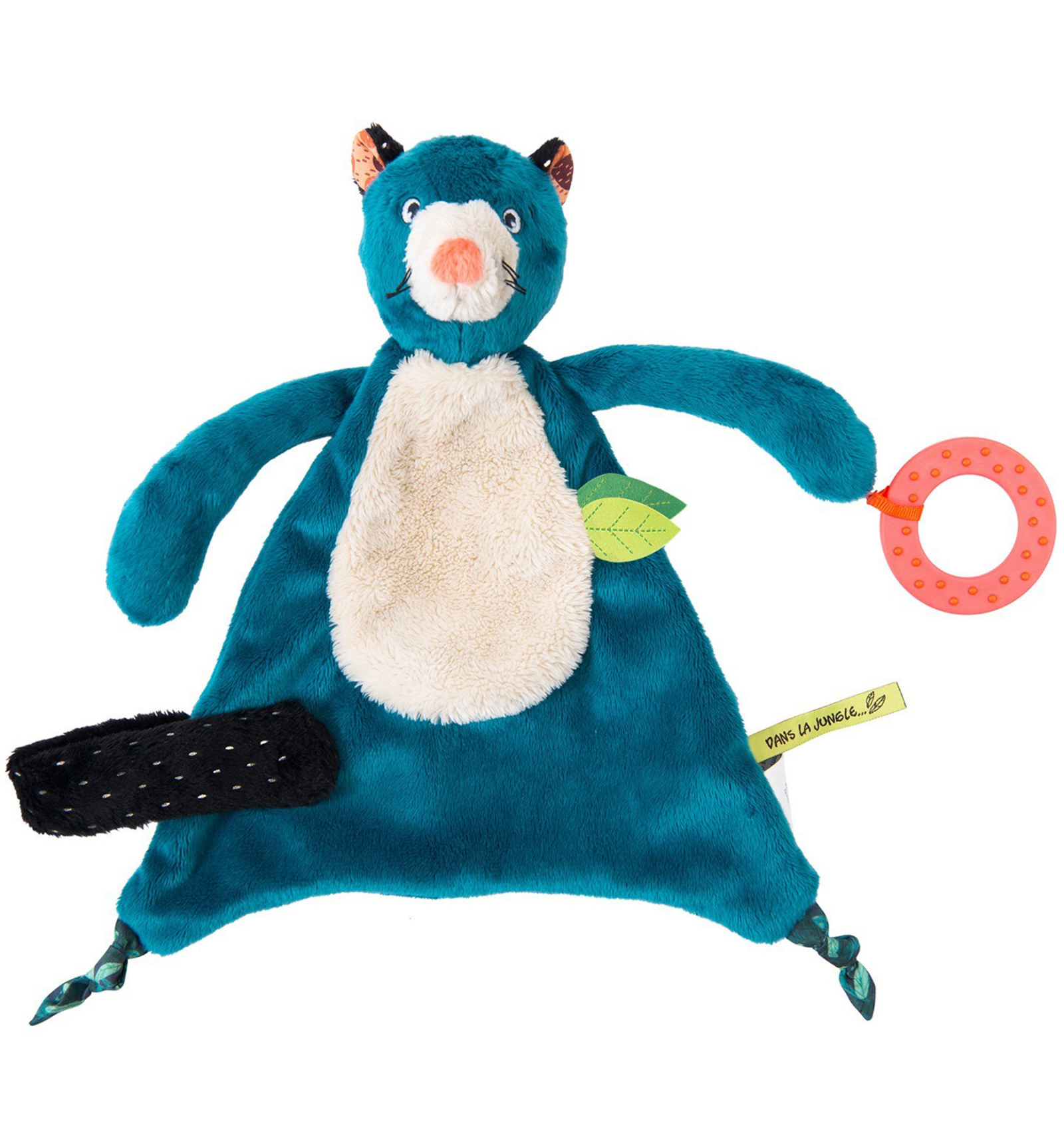 La pantera Zimba de Moulin Roty es doudou, mordedor y porta chupete. Como doudou, acompañará a tu bebé a la hora de calmarse o de dormir; como mordedor, aliviará los dolores de la dentición; y como porta chupetes, permite colgar el chupete para no perderlo. Desde el nacimiento.