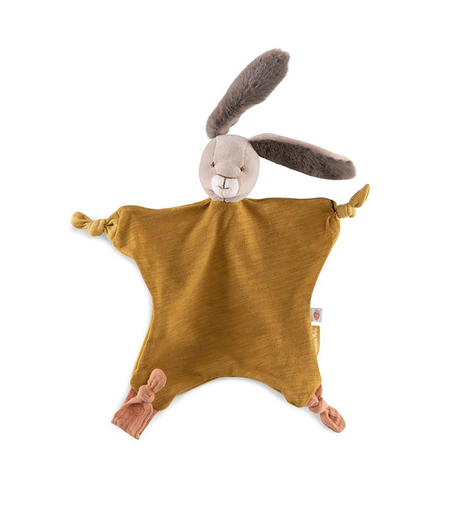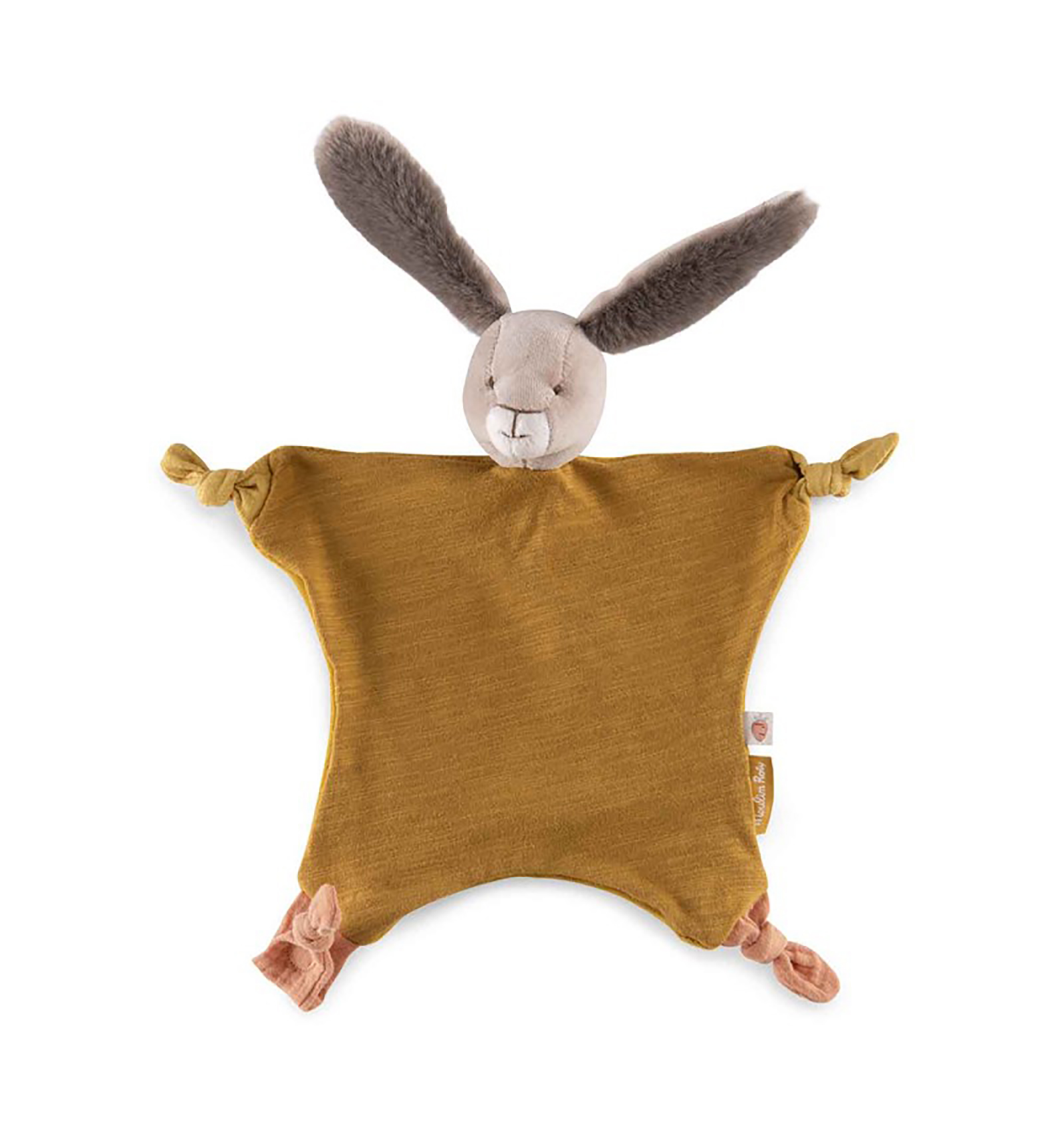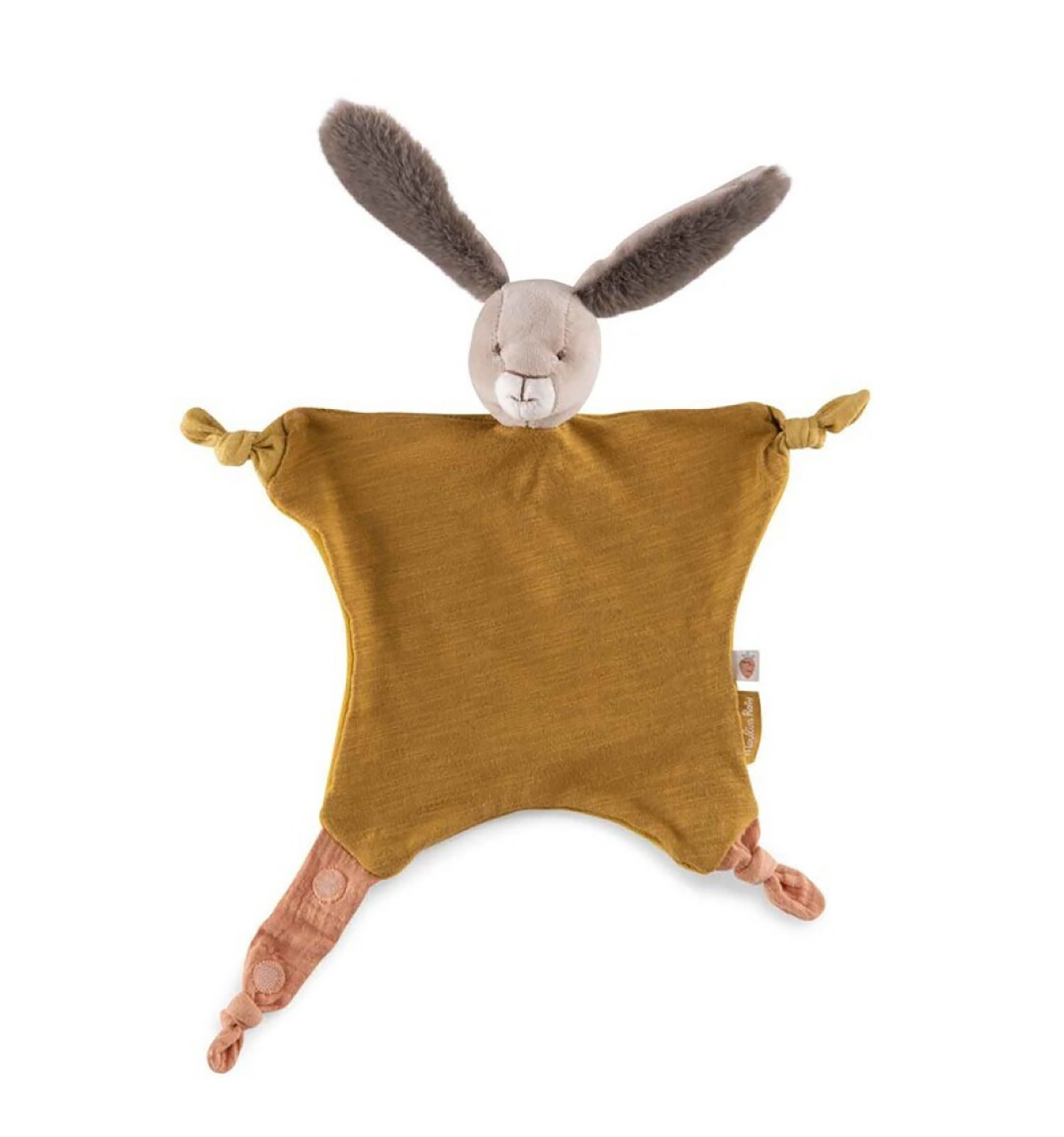 ¡Que bello doudou conejo! Un suave doudou de color ocre, que será el nuevo compañero inseparable de tu bebé desde su nacimiento. Súper fácil de agarrar y con una cinta para llevar el chupete, por lo que es ideal tanto dentro como fuera de casa. Y es de la fantástica colección de "Trois petits lapins" de Moulin Roty.
