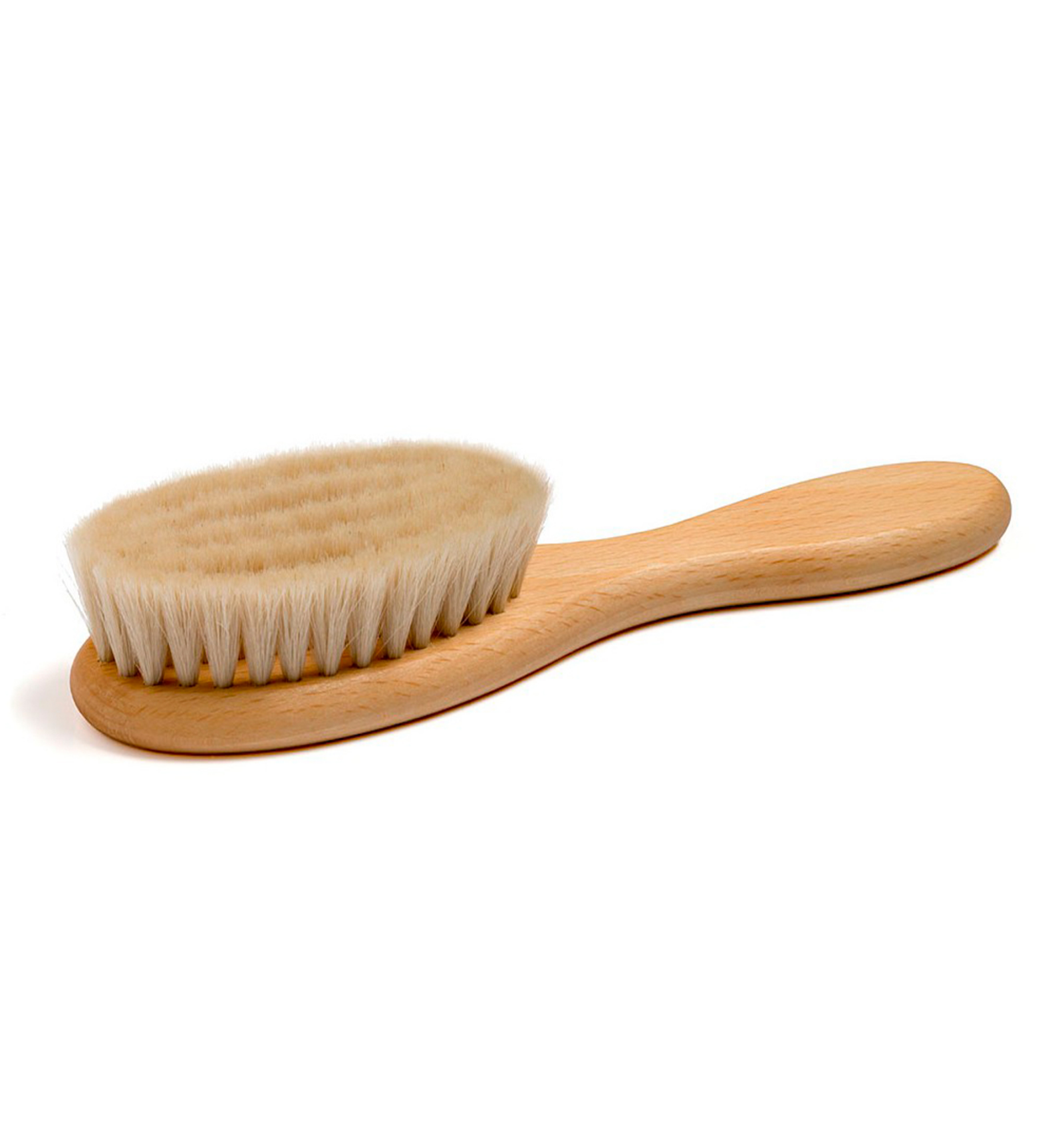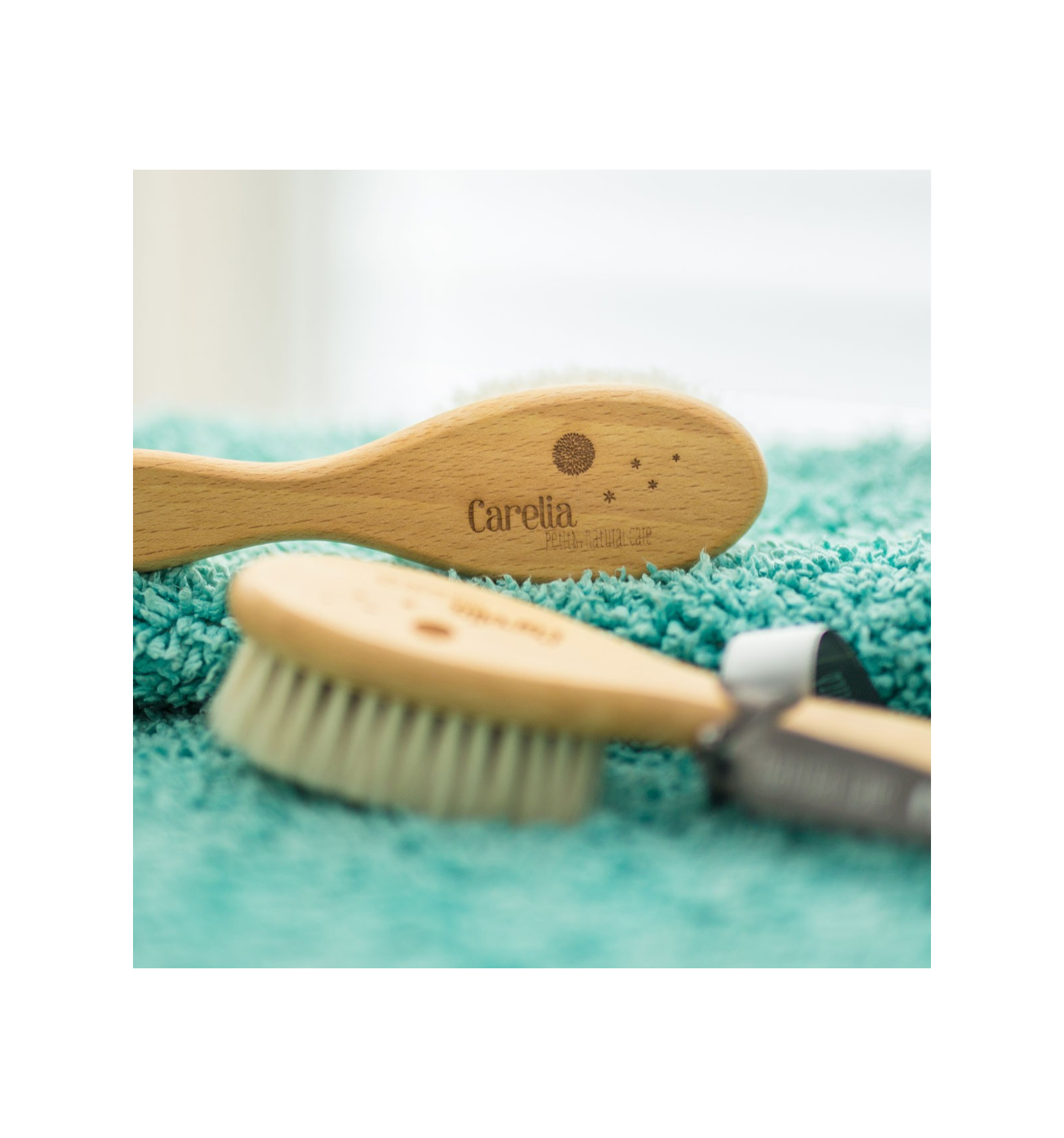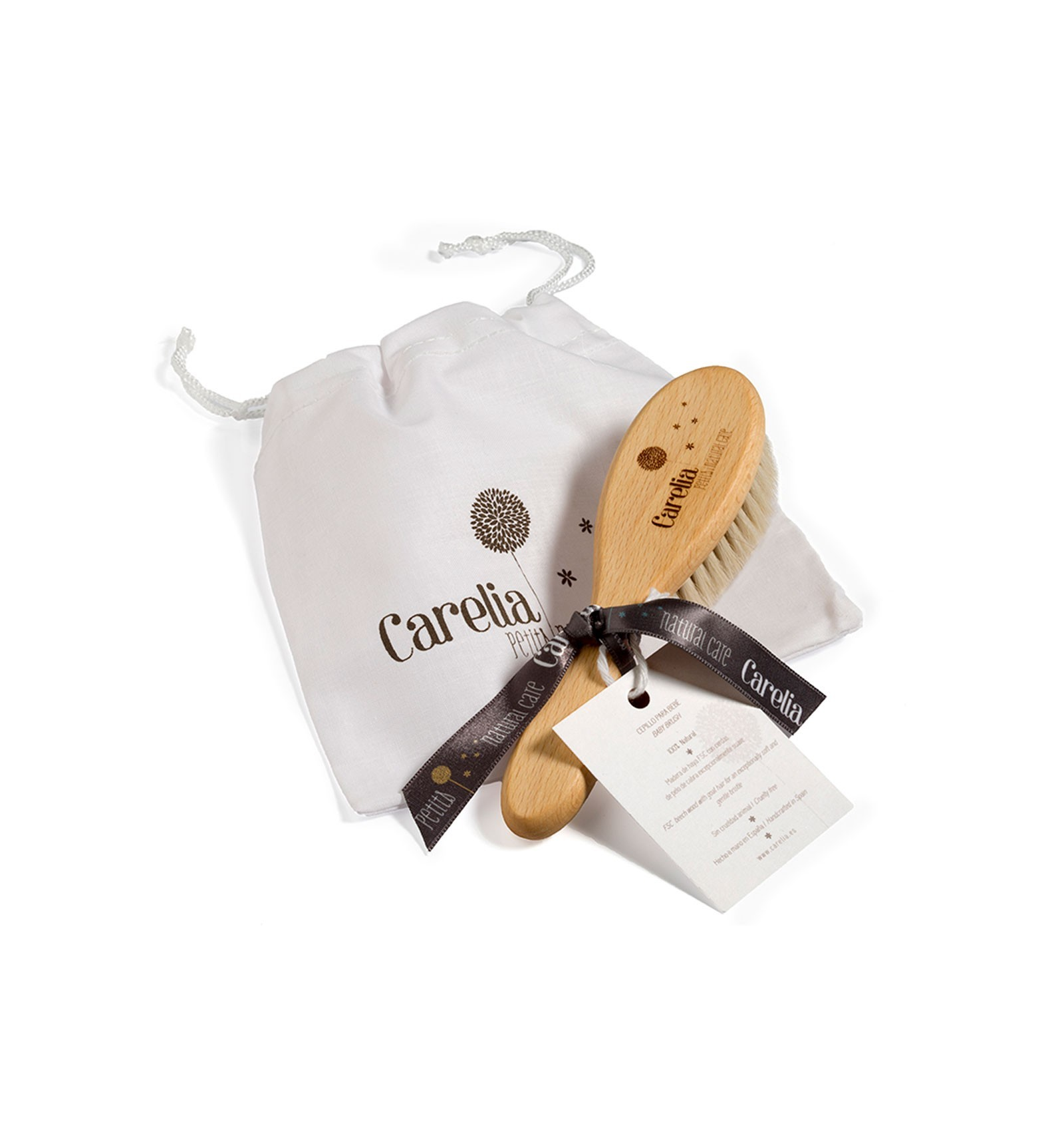 Suave cepillo natural de madera de haya europea y con cerdas de finísimo pelo de cabra. Peina delicadamente a tu bebé, repartiendo la grasa natural de su cabello. Con cerdas antiestáticas y que no resecan ni quiebran el pelo. Ideal, además, para proporcionar un agradable y tranquilizador masaje en su barriguita.
