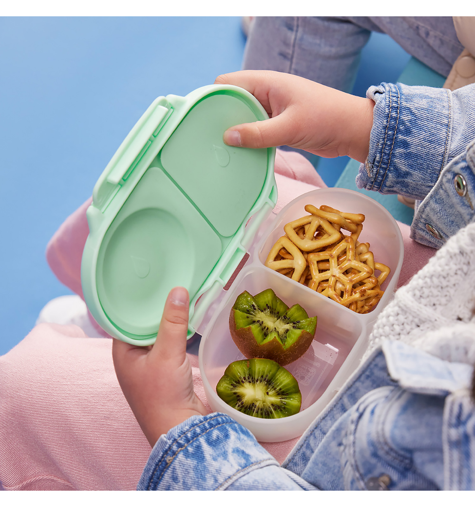 Incluye además un compartimento exclusivo para fruta con almohadilla elástica, que permite transportar piezas enteras sin necesidad de cortarlas. Su diseño ergonómico, con asas y pinza de agarre grande, hace que sea muy fácil de abrir, fomentando la independencia de los más pequeños.