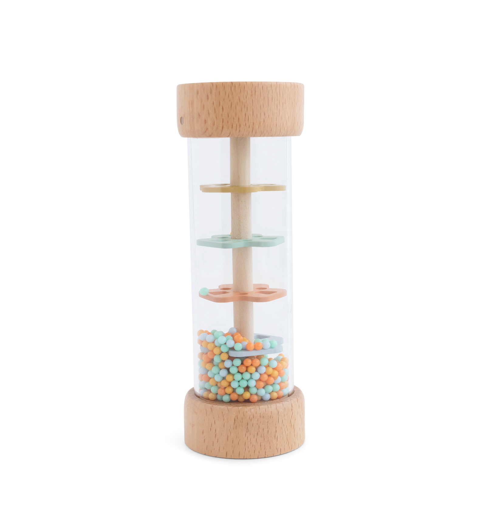 El sonajero de madera tipo lluvia será el juguete favorito de tu bebé gracias a su efecto relajante e hipnótico. Al girarlo, las pequeñas bolitas se deslizan suavemente a través del tubo y sus separadores, produciendo un sonido que recuerda a las gotas de lluvia, perfecto para calmar y entretener.