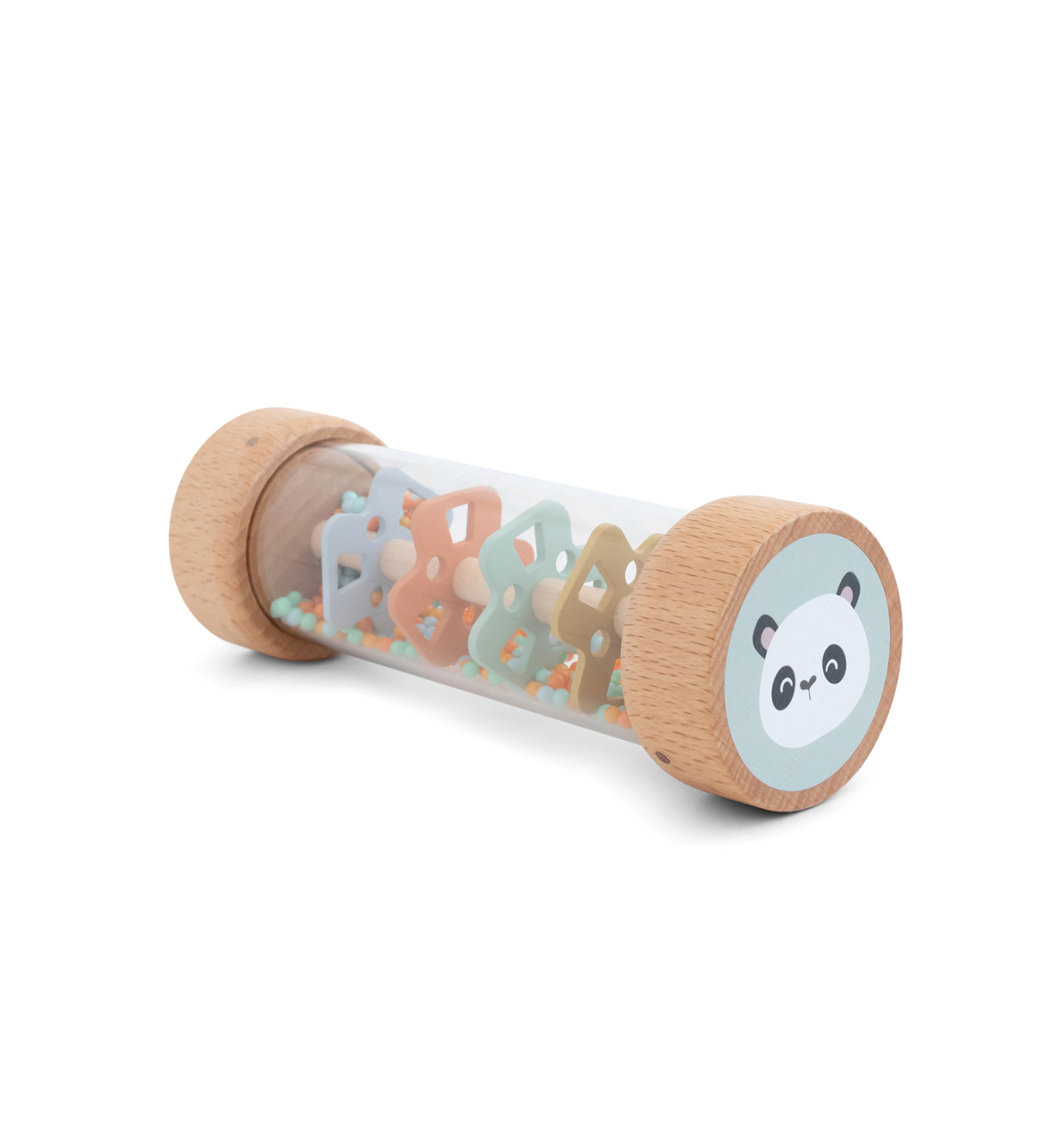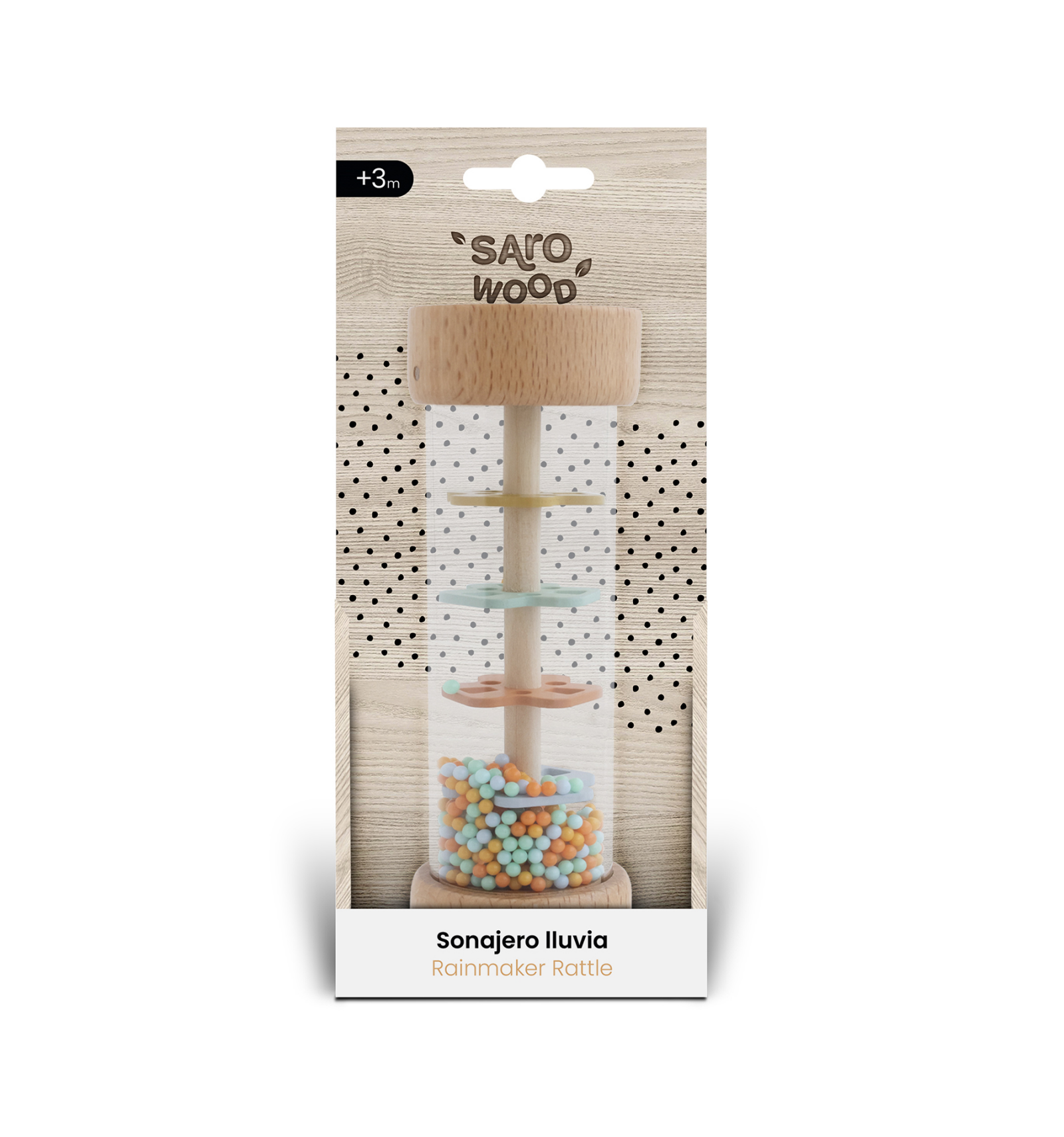 Sonajero de madera con efecto lluvia que estimula los sentidos del bebé. Al girarlo, las bolitas crean un sonido suave y relajante. Fácil de sostener, fabricado en madera FSC resistente y respetuosa con el medioambiente. Ideal para estimular la vista, el oído y la coordinación.