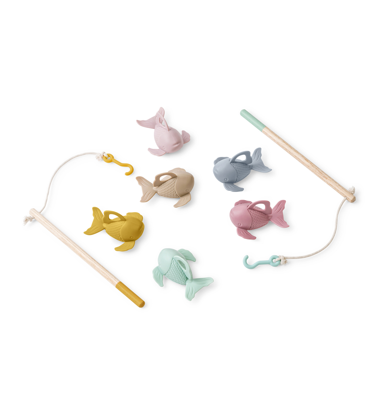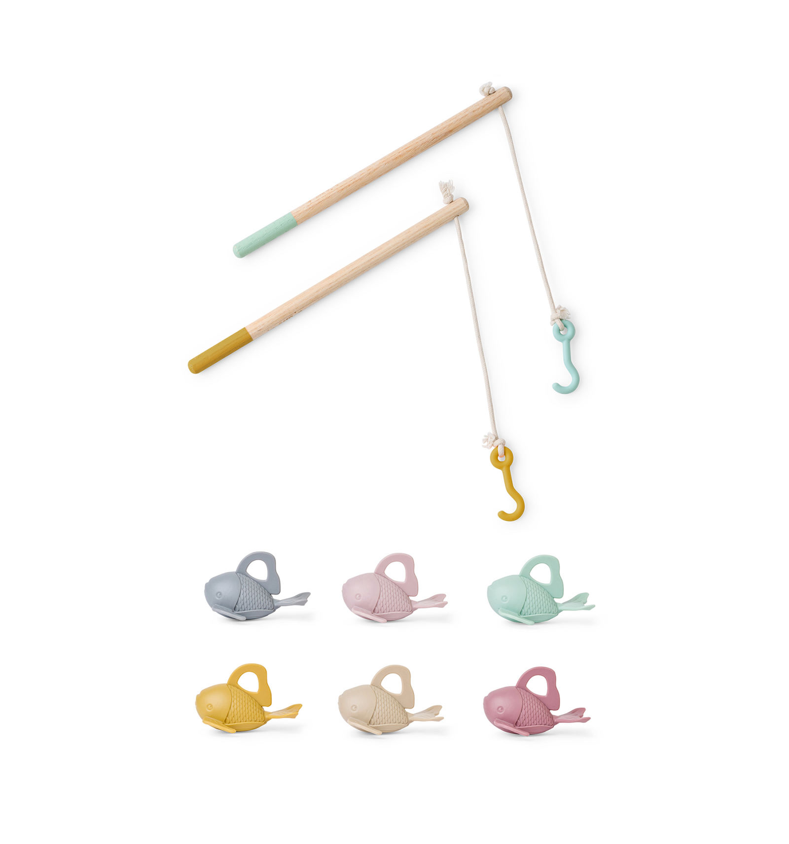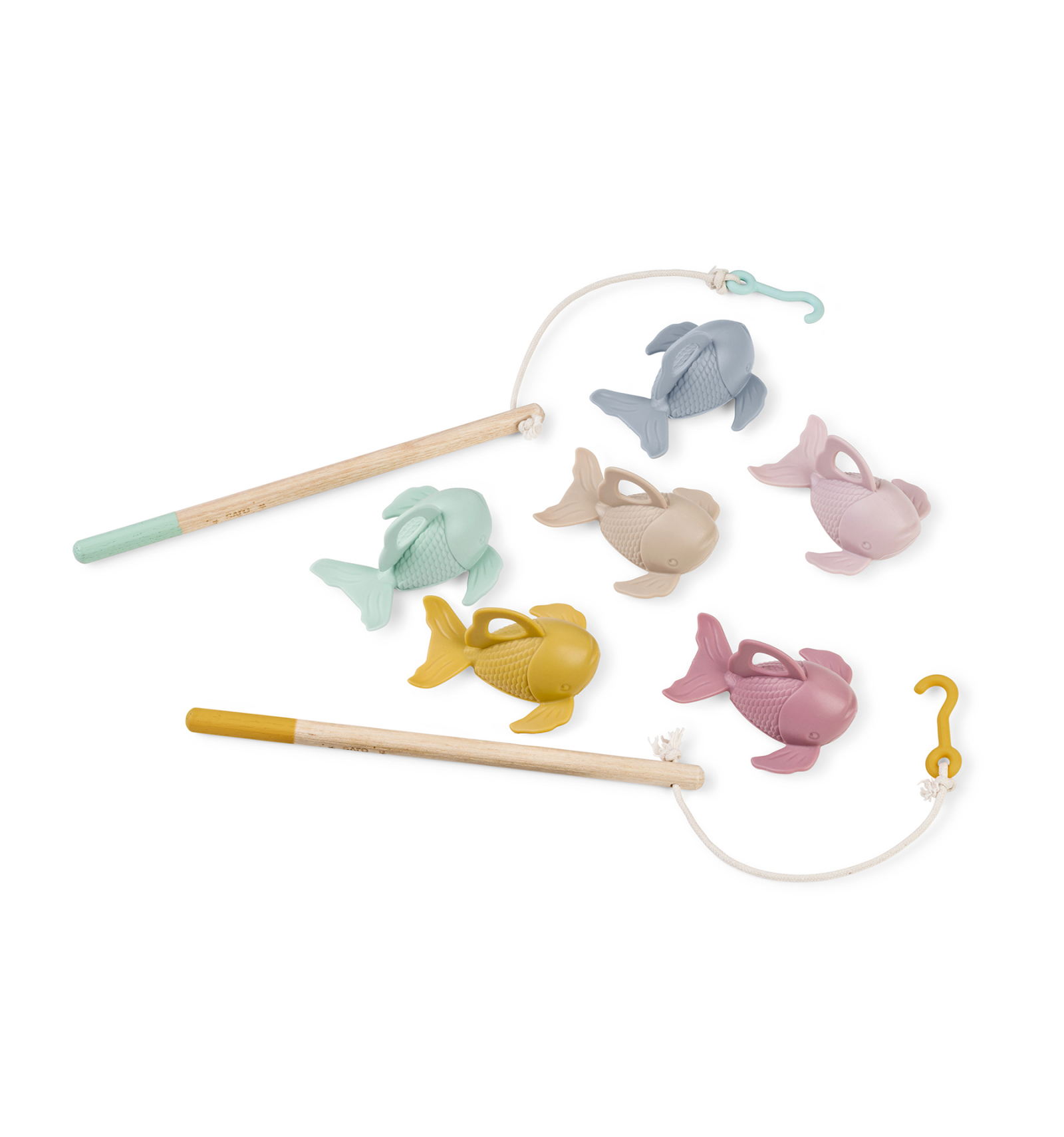 Juego de pesca Saro con peces de silicona y cañas. Ideal para baño o exterior, fomenta la coordinación, la concentración y el juego.