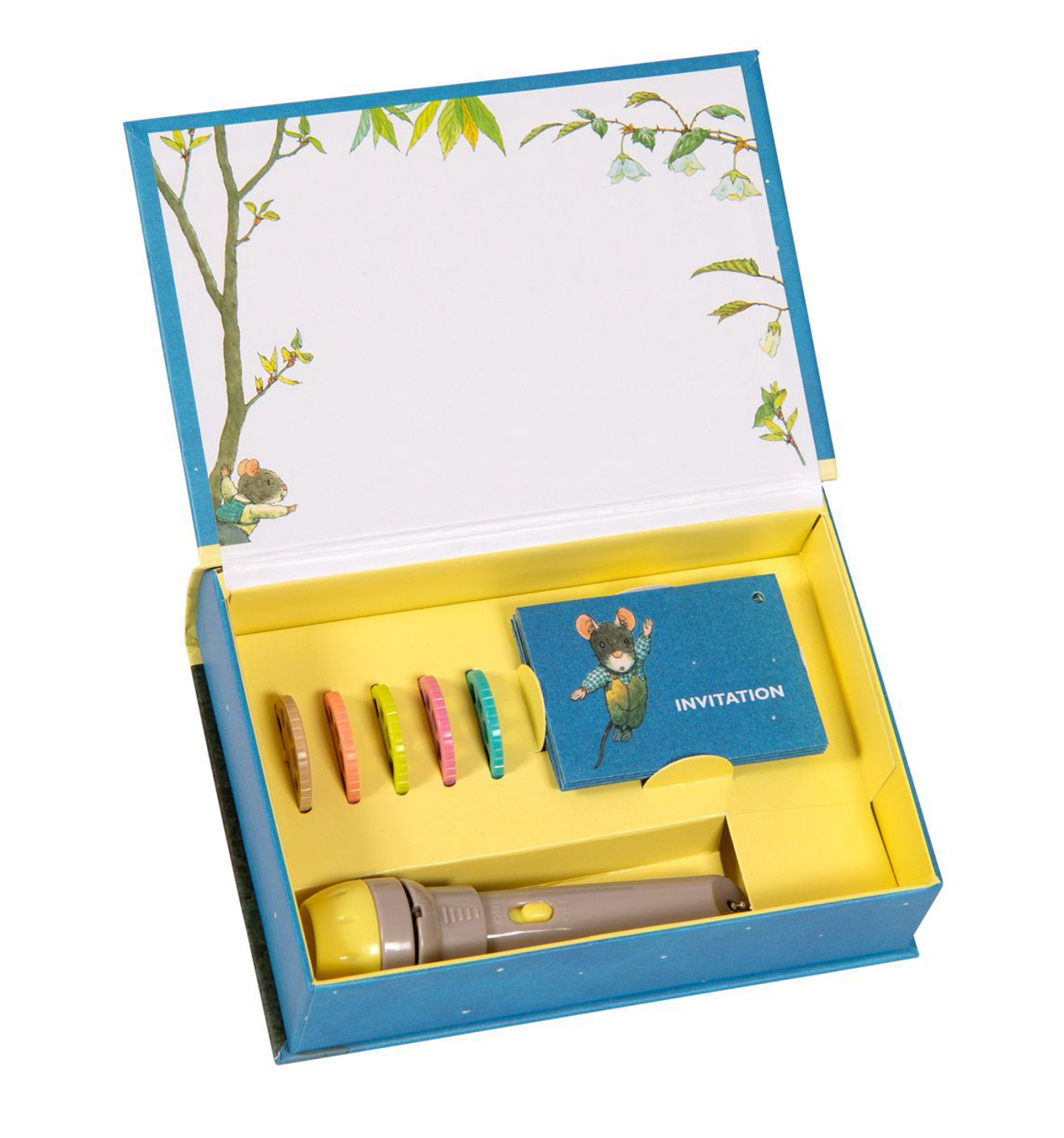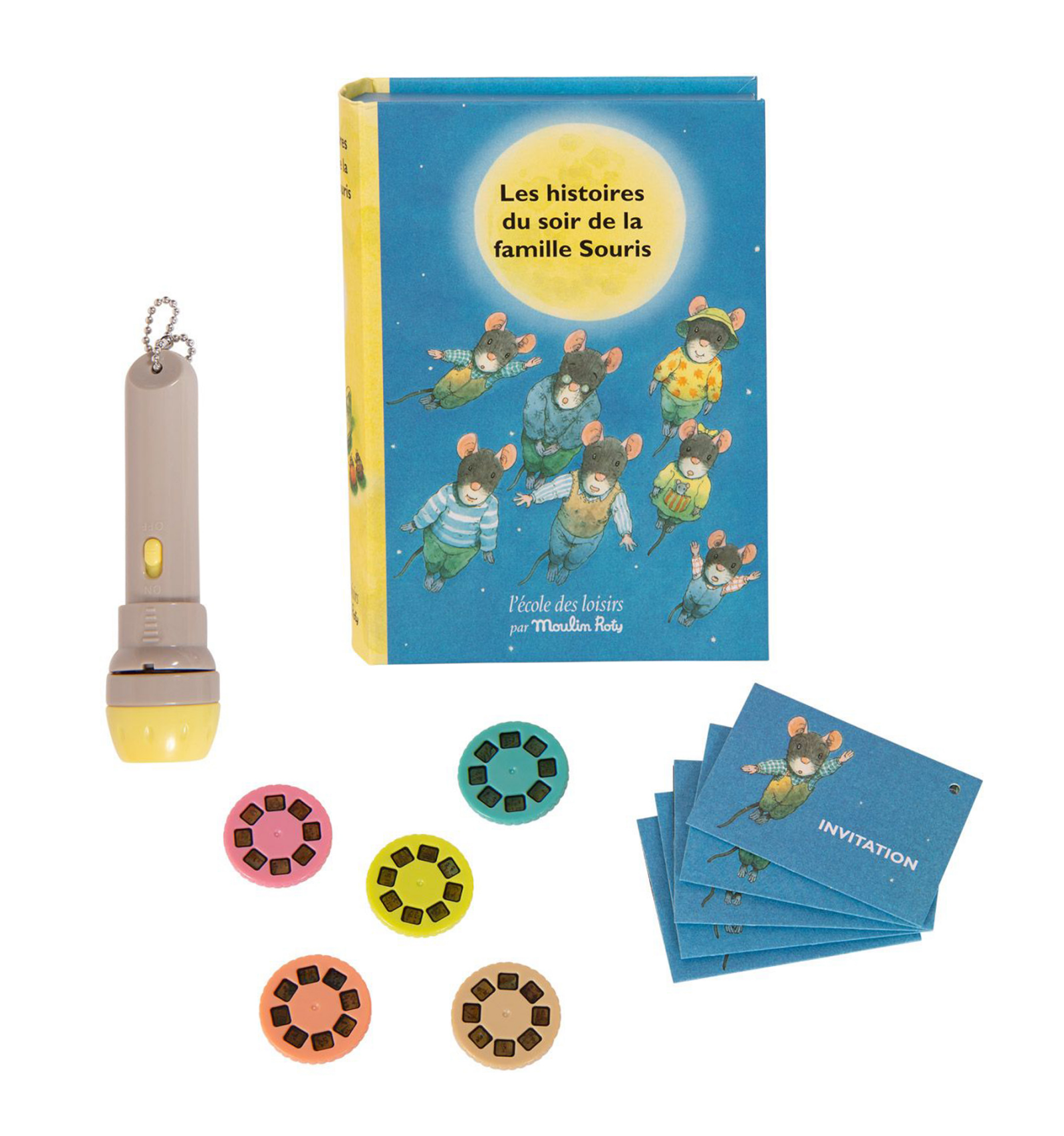 Pasen y vean, ¡el cinematógrafo! Una caja del cine con historias de la familia de ratoncitos para narrar los cuentos de la noche de una manera de lo más original. Con una linterna de cuentos, 5 discos con 8 diapositivas cada uno, y 5 tarjetas de invitación a los espectáculos. A partir de 3 años.