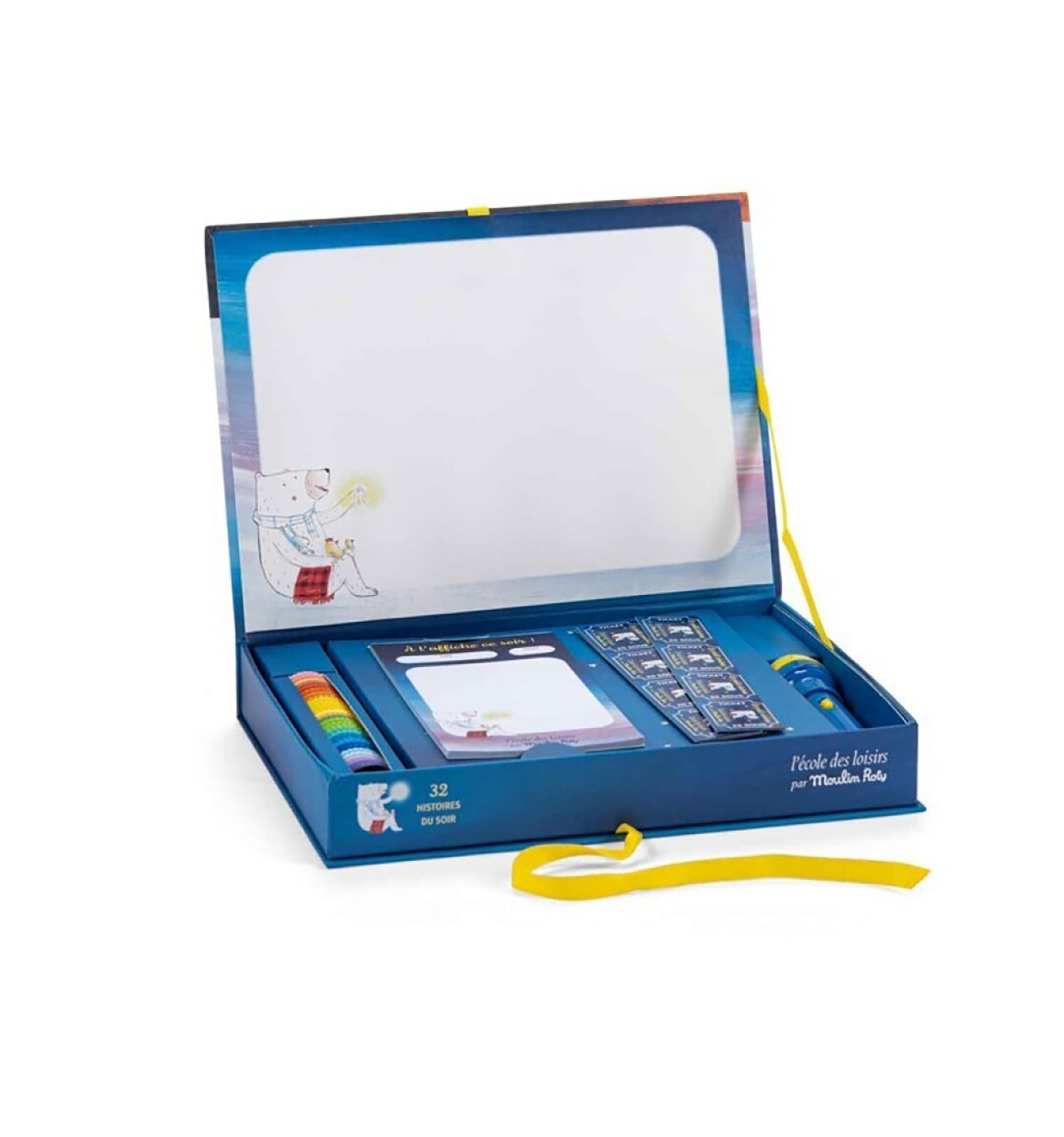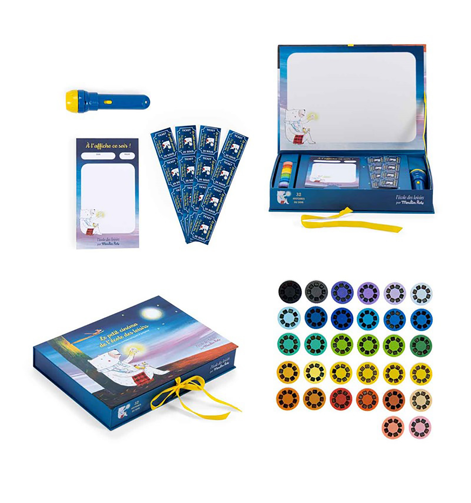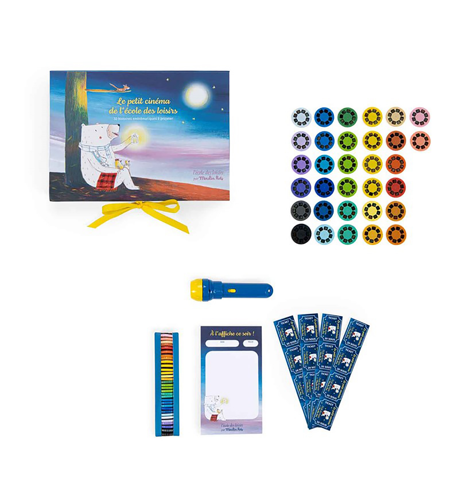 Pasen y vean, ¡el cinematógrafo! Una caja del cine edición De Luxe con historias para narrar los cuentos de la noche de manera original. Con un bloc de notas para escribir el título de la película que se va a proyectar en casa, una linterna de cuentos, 32 discos con 8 diapositivas cada uno y ¡entradas para la sesión! A partir de 3 años. Tamaño: 28 x 18cm.
