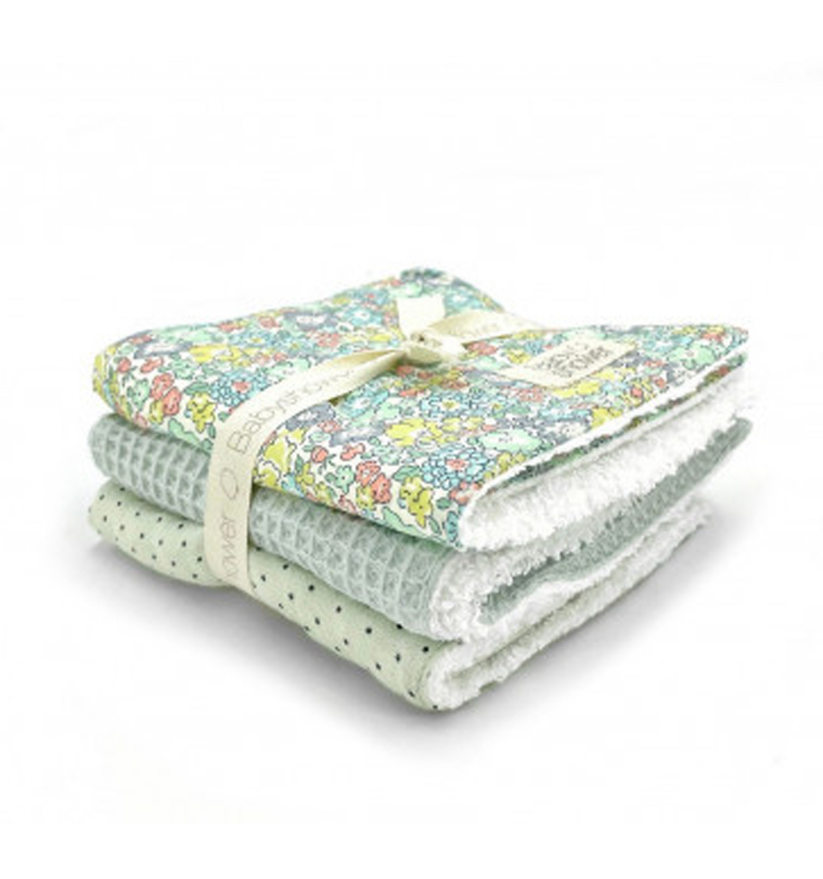 Pack con 3 toallitas de tela multiusos en elegantes estampados. Puedes usarlas para mantener limpio el cojín de la cuna, limpiar las babitas del bebé, tener un apoyo limpio para su cabecita, o durante el eructo. Elaboradas con un lado en rizo en algodón 100%.