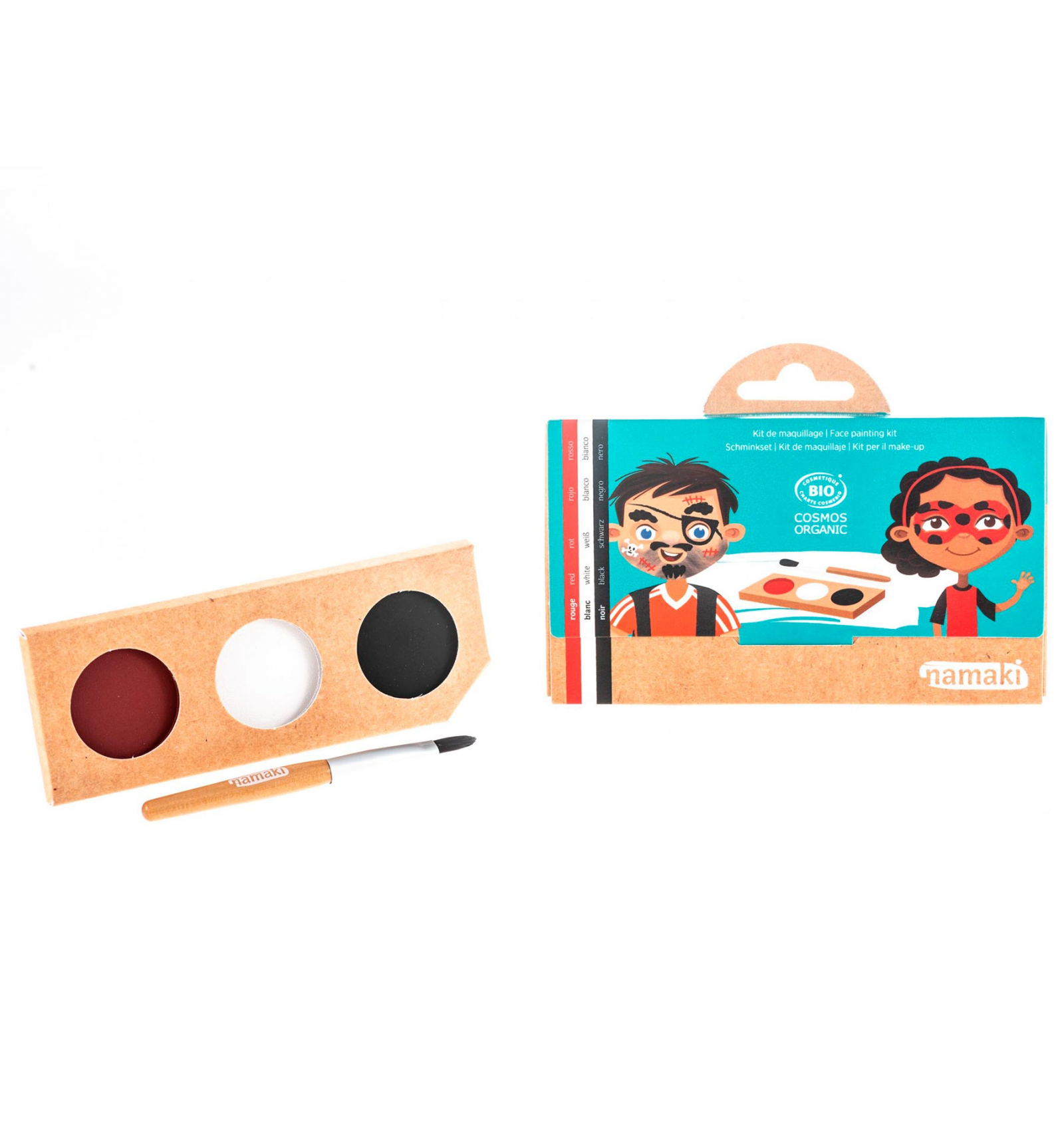 El kit de maquillaje Namaki se compone por un estuche de cartón, tres pastillas de colores (3 x 2.5 g), un pincel y dos tutoriales como propuesta de maquillaje.