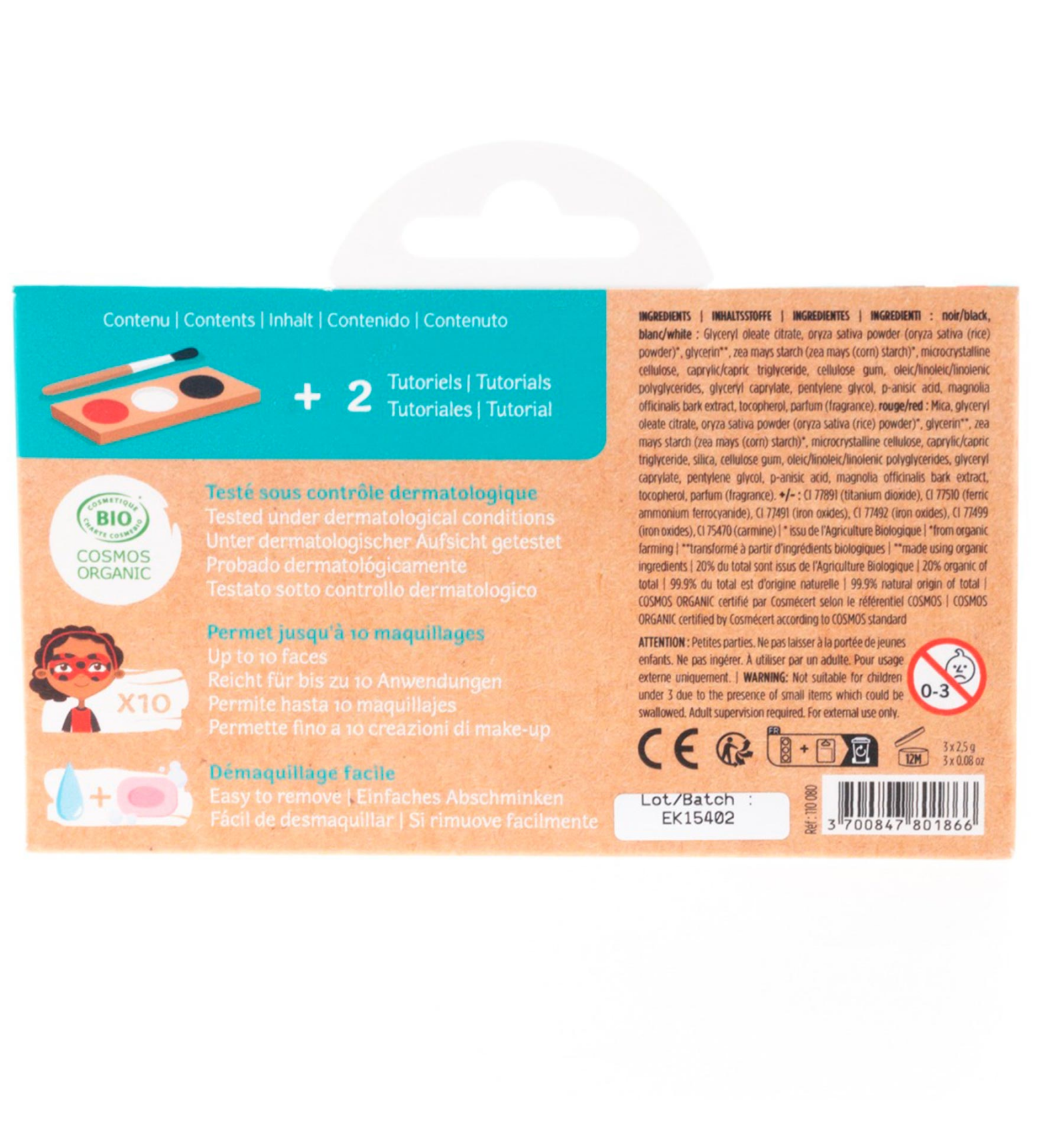 Sus productos son eco-concebidos desde su formulación hasta su embalaje, de cartón íntegramente. Fáciles de usar incluso para los más pequeños, estaremos siempre tranquilos si son ellos los que quieren maquillarse solos pues al ser productos únicamente naturales, nos dan la seguridad y tranquilidad al verlos pintarse sus caras como sólo ellos saben hacer.