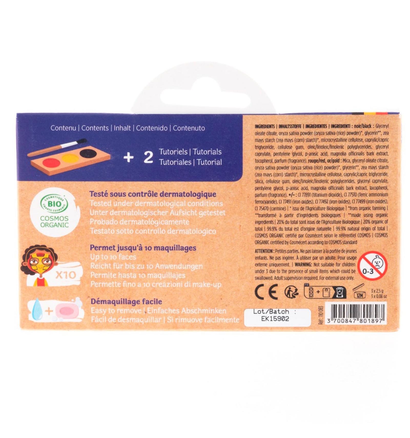 Sus productos son eco-concebidos desde su formulación hasta su embalaje, de cartón íntegramente. Fáciles de usar incluso para los más pequeños, estaremos siempre tranquilos si son ellos los que quieren maquillarse solos pues al ser productos únicamente naturales, nos dan la seguridad y tranquilidad al verlos pintarse sus caras como sólo ellos saben hacer.