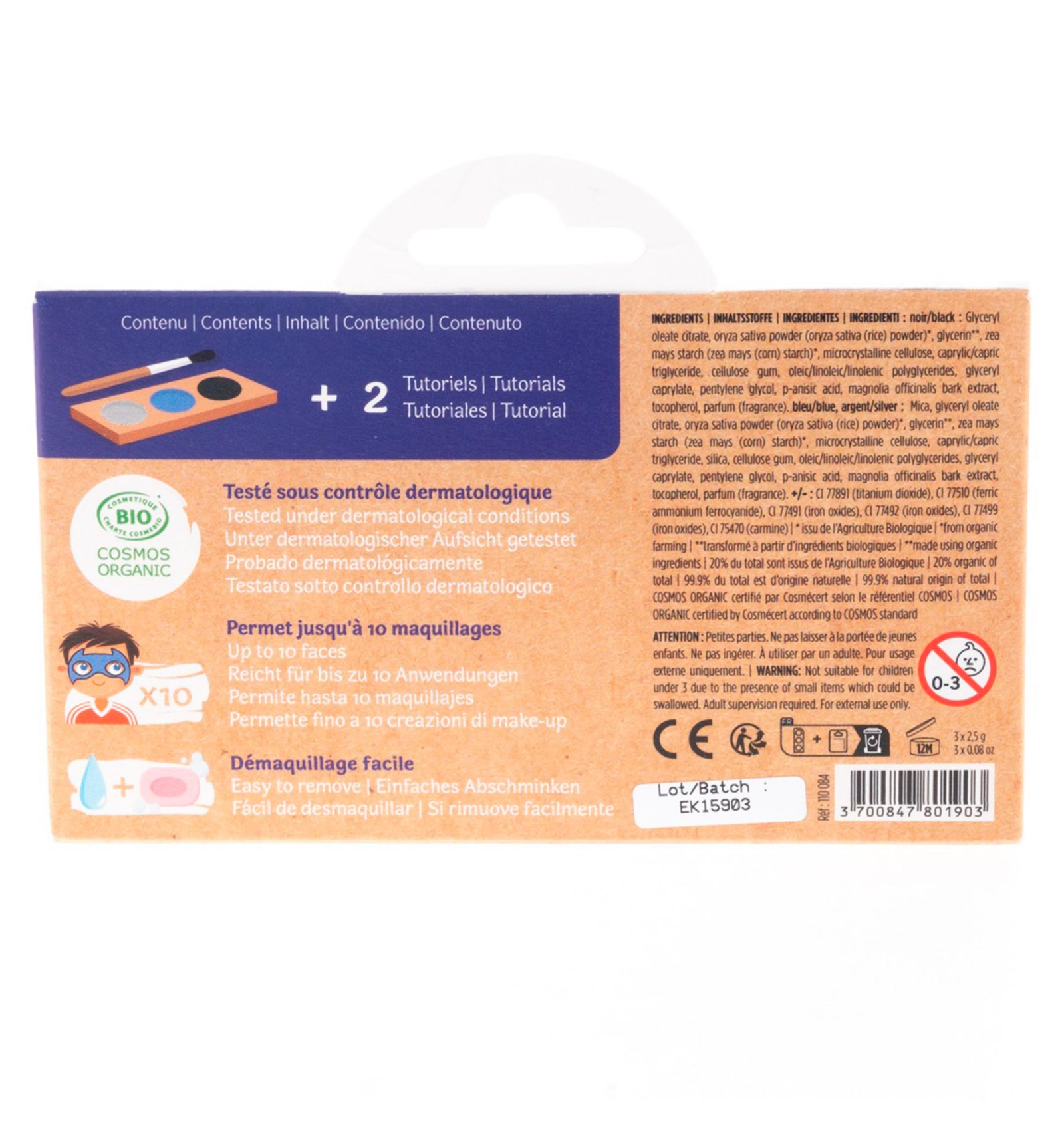 El primer maquillaje con certificación bio. El 99% de los ingredientes que lo componen son de origen natural. Esto lo hace ideal para las pieles sensibles como la de los más pequeños de la casa.