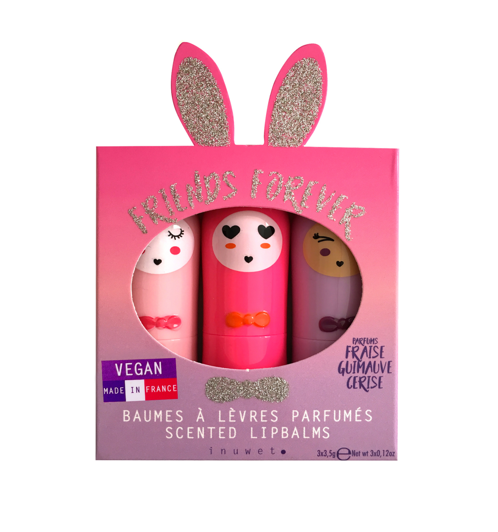 Pack de bálsamos labiales con aromas a fresa, cereza y nube. Nutren, reparan y protegen los labios con ingredientes naturales. Veganos y fabricados en Francia.