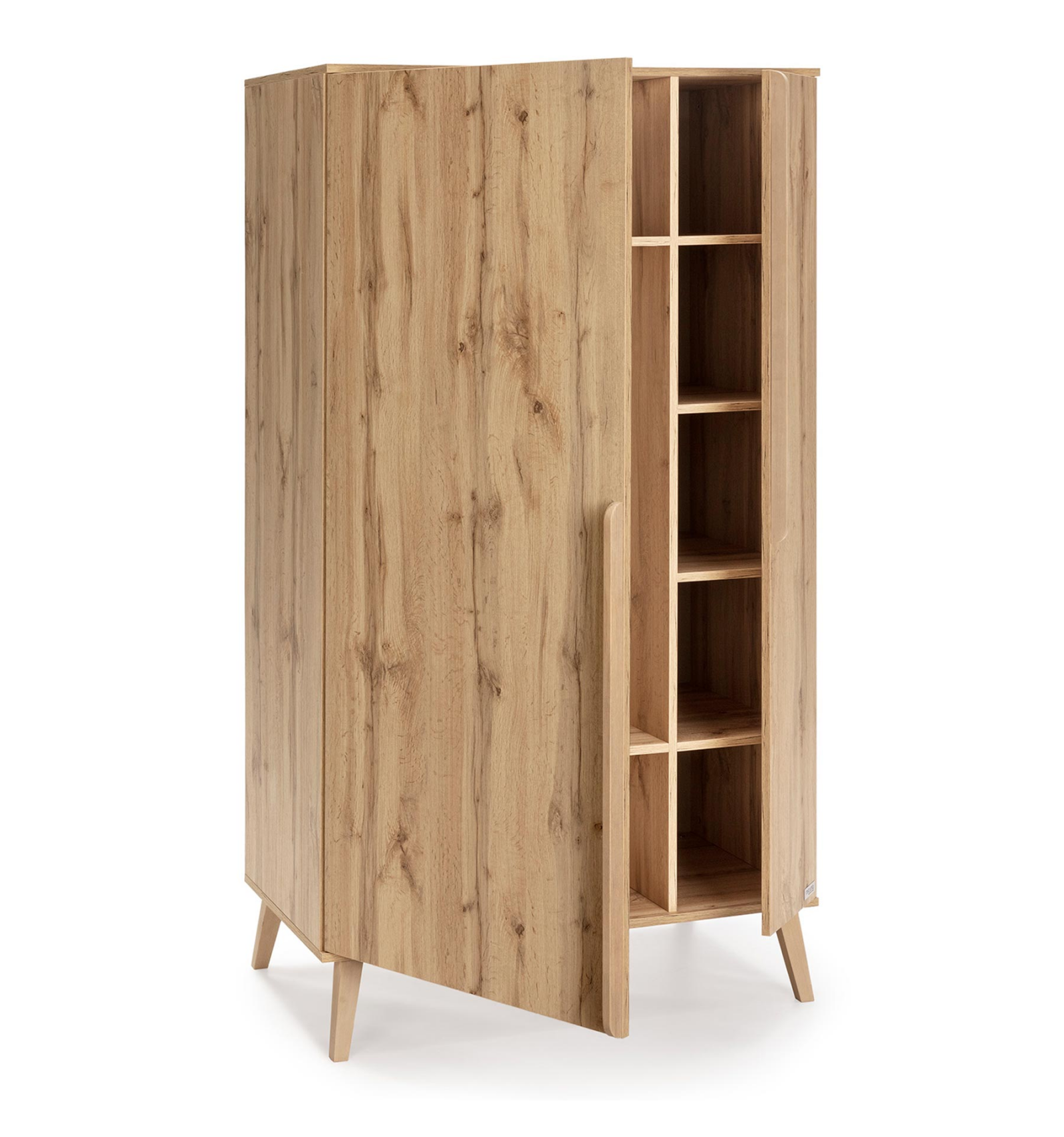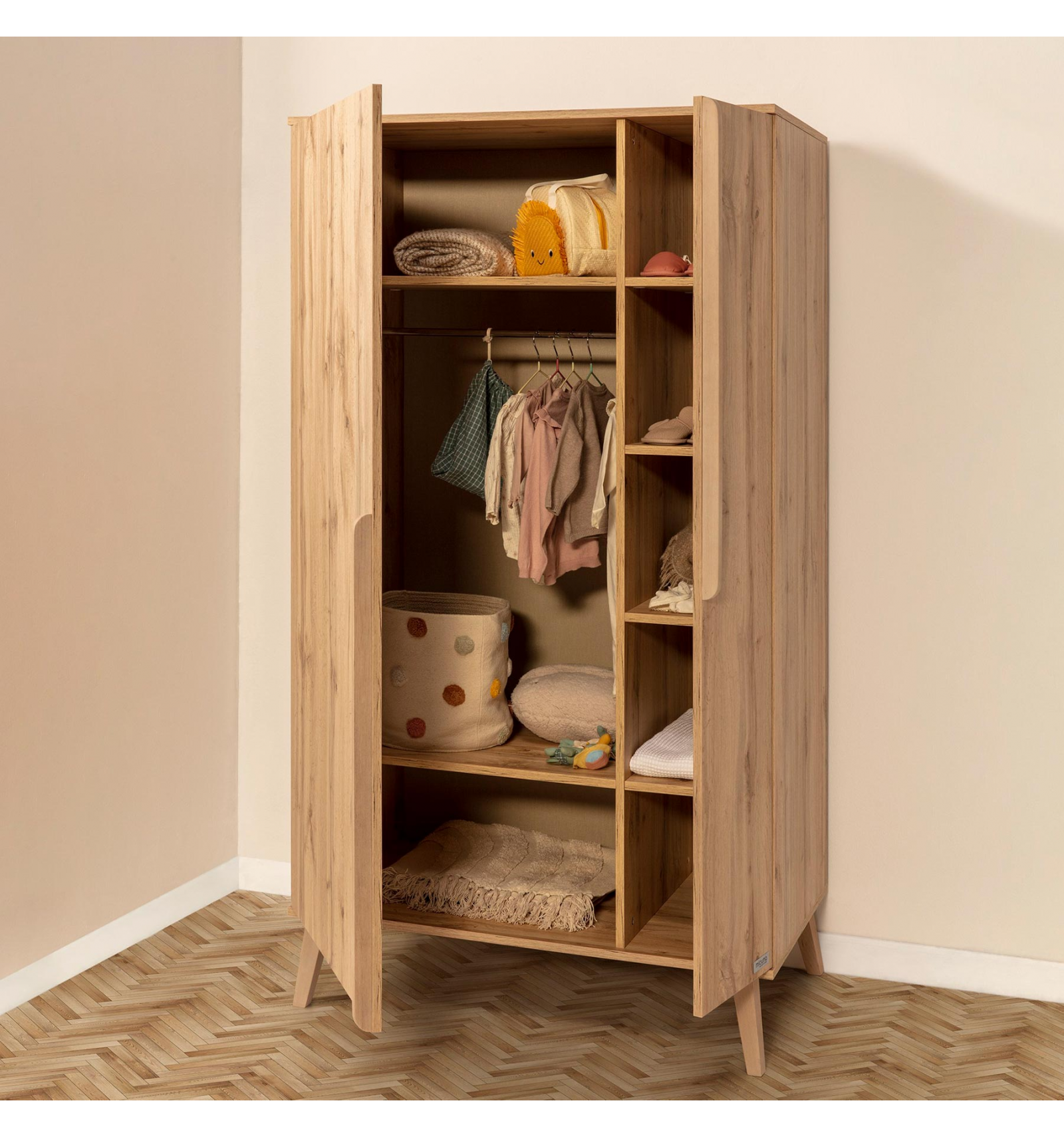 Inspirada en un estilo natural y fabricada con maderas procedentes de bosques sostenibles, el armario de la colección Martha con su acabado en roble dará un toque muy elegante a la habitación de tu peque.