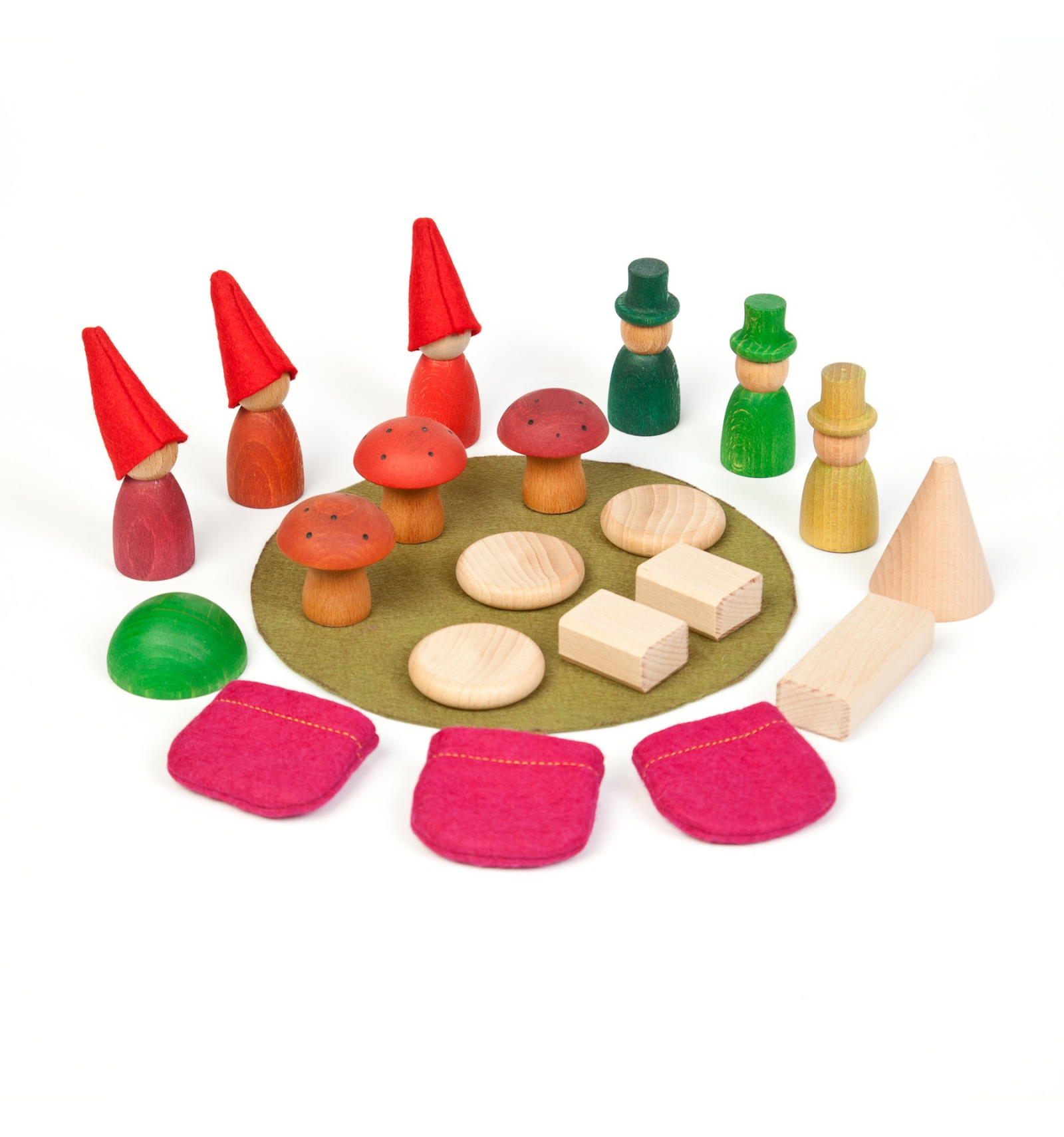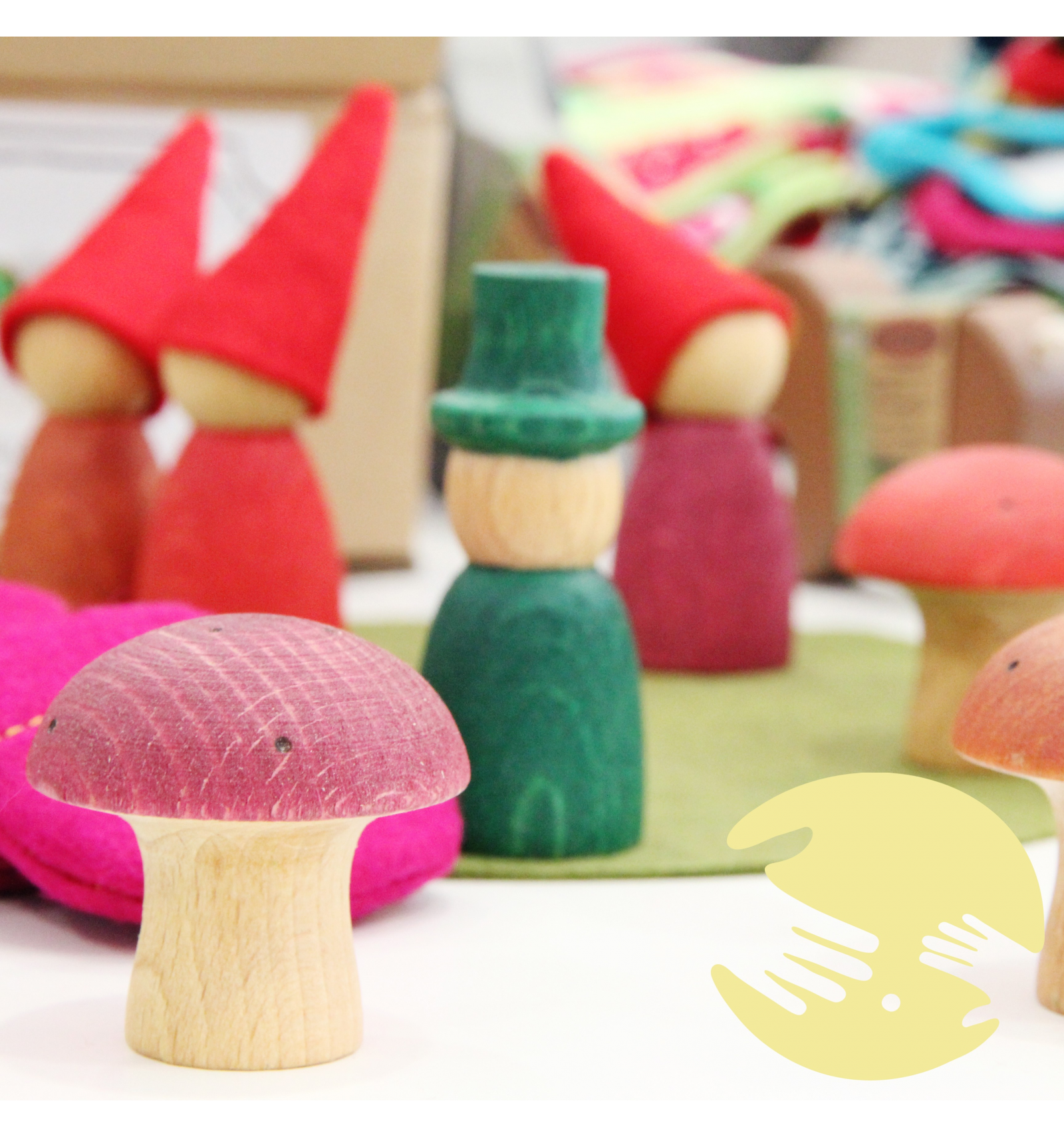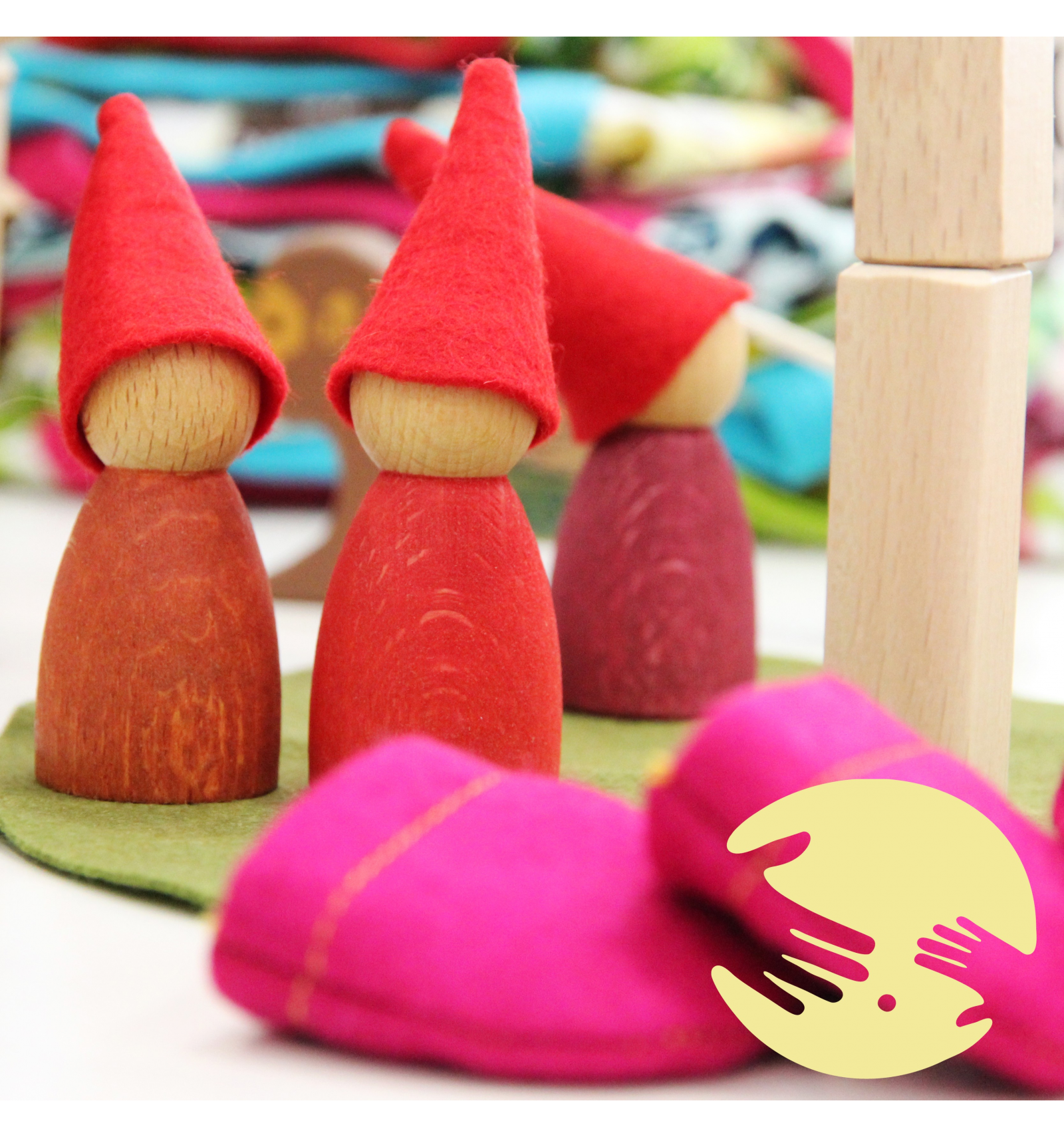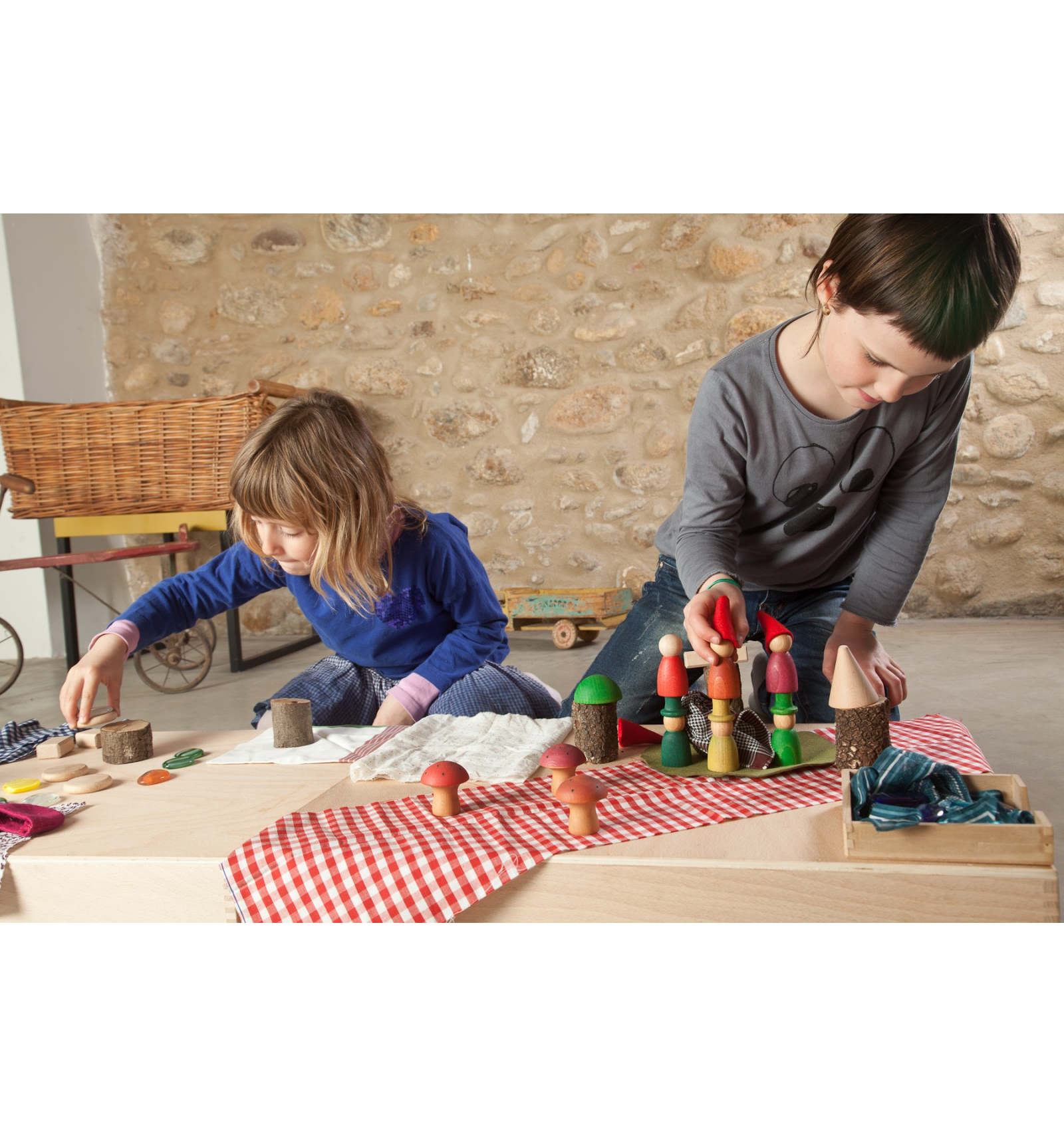 Con los Nins del Bosque se pueden crear historias y construir mini mundos. Es un material no estructurado, sin ojos, ni género, para que los niños y niñas puedan imaginar sus propios cuentos y leyendas. Combinados con otros materiales pueden acompañar juegos matemáticos, de lenguaje, sensoriales, etc.