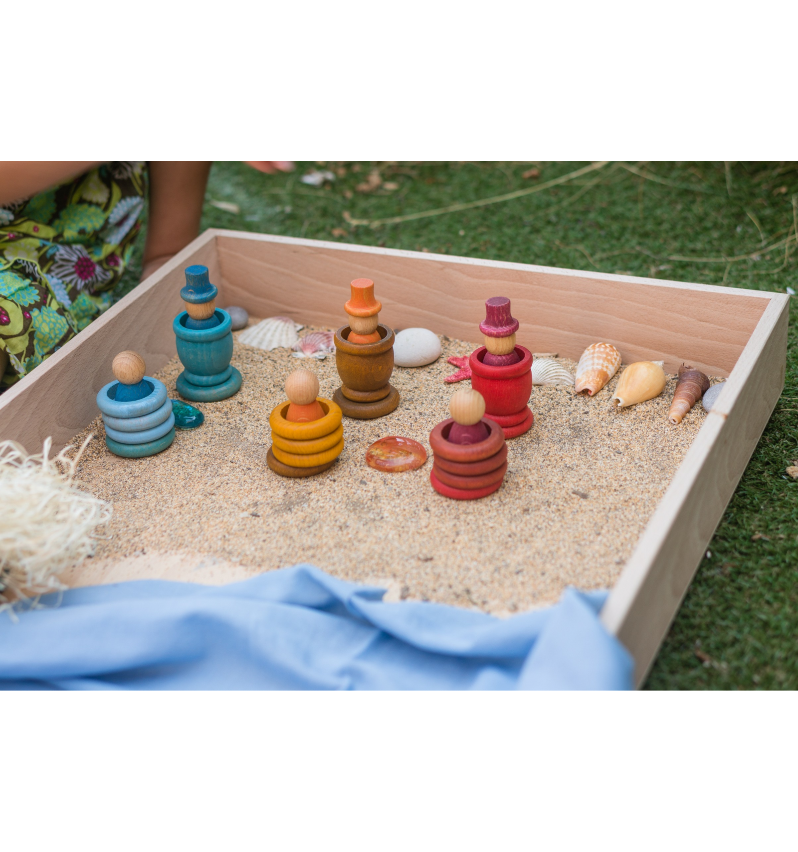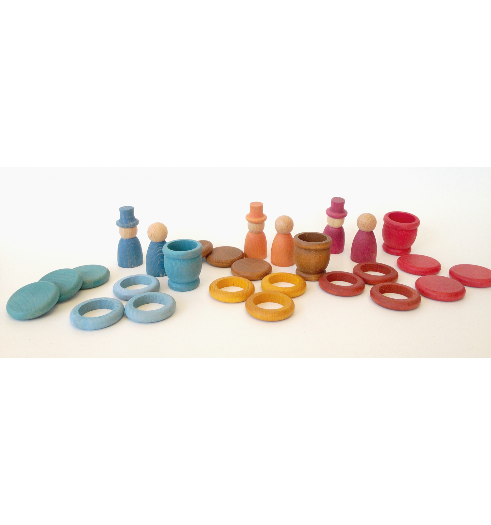 Set de 27 piezas de madera, formado por muñecos Nins®, magos, anillas y monedas con los colores del Verano.