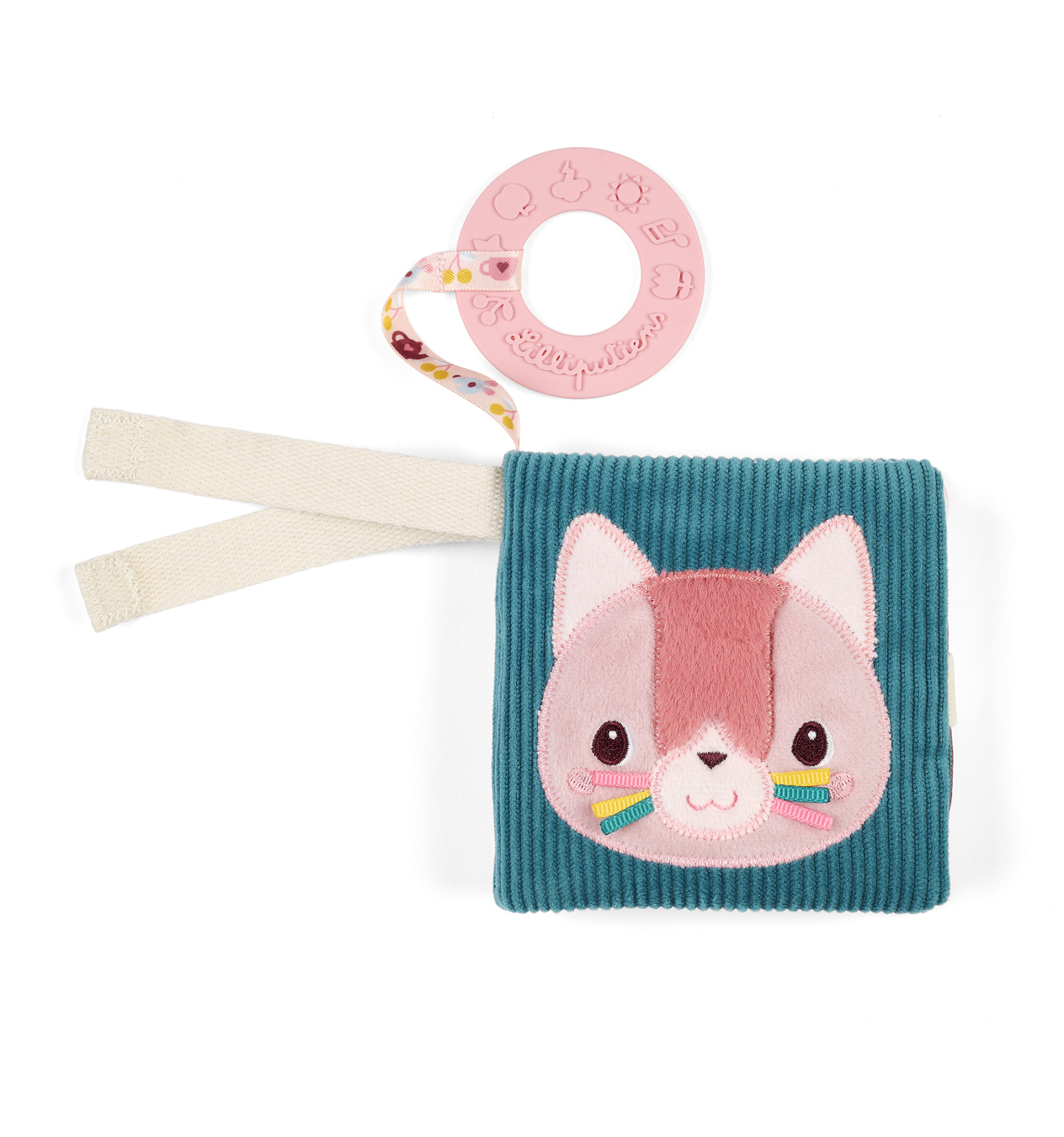 Libro sensorial Jeanne de Lilliputiens de tela para bebés desde 6 meses. Con texturas, colores y mordedor, estimula los sentidos y el desarrollo.
