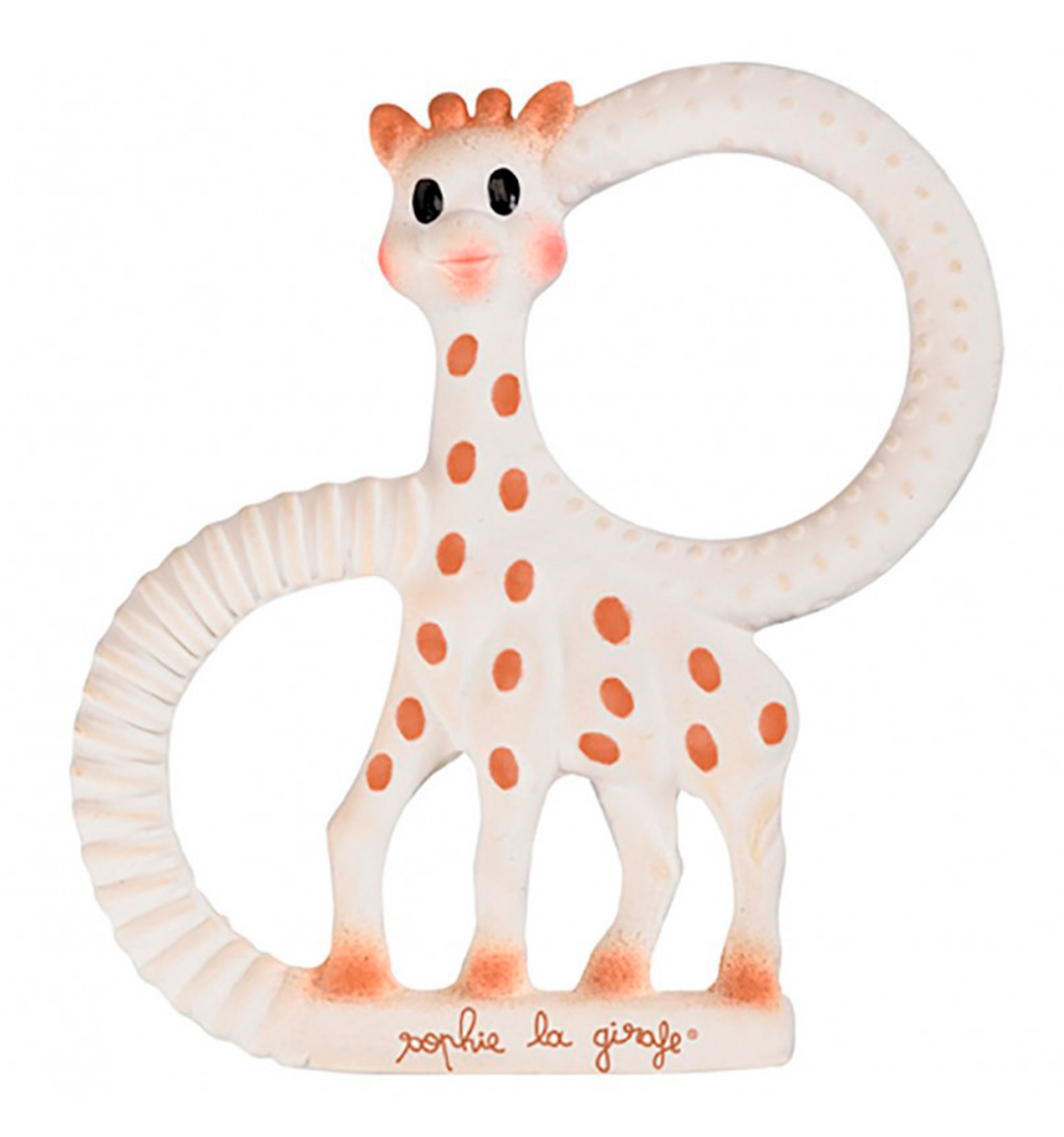La hermana pequeña de la famosa jirafa mordedor Sophie. Anillo de dentición con diferentes texturas para aliviar las distintas etapas de los empujes dentarios. Fácil de coger por las pequeñas manos del bebé. De caucho 100% natural.