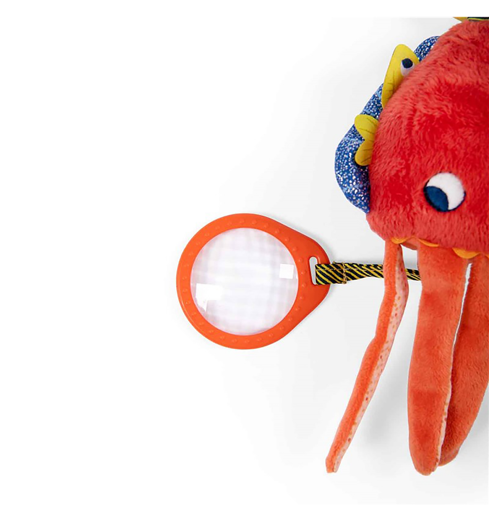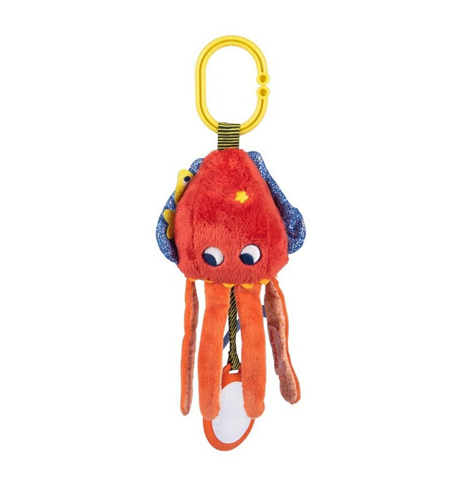 Tentáculos que crujen como el papel, una cabeza que suena cuando la agitas y un caleidoscopio es lo que encontramos en esta simpática sepia que podemos colgar en cualquier parte gracias a su anilla.