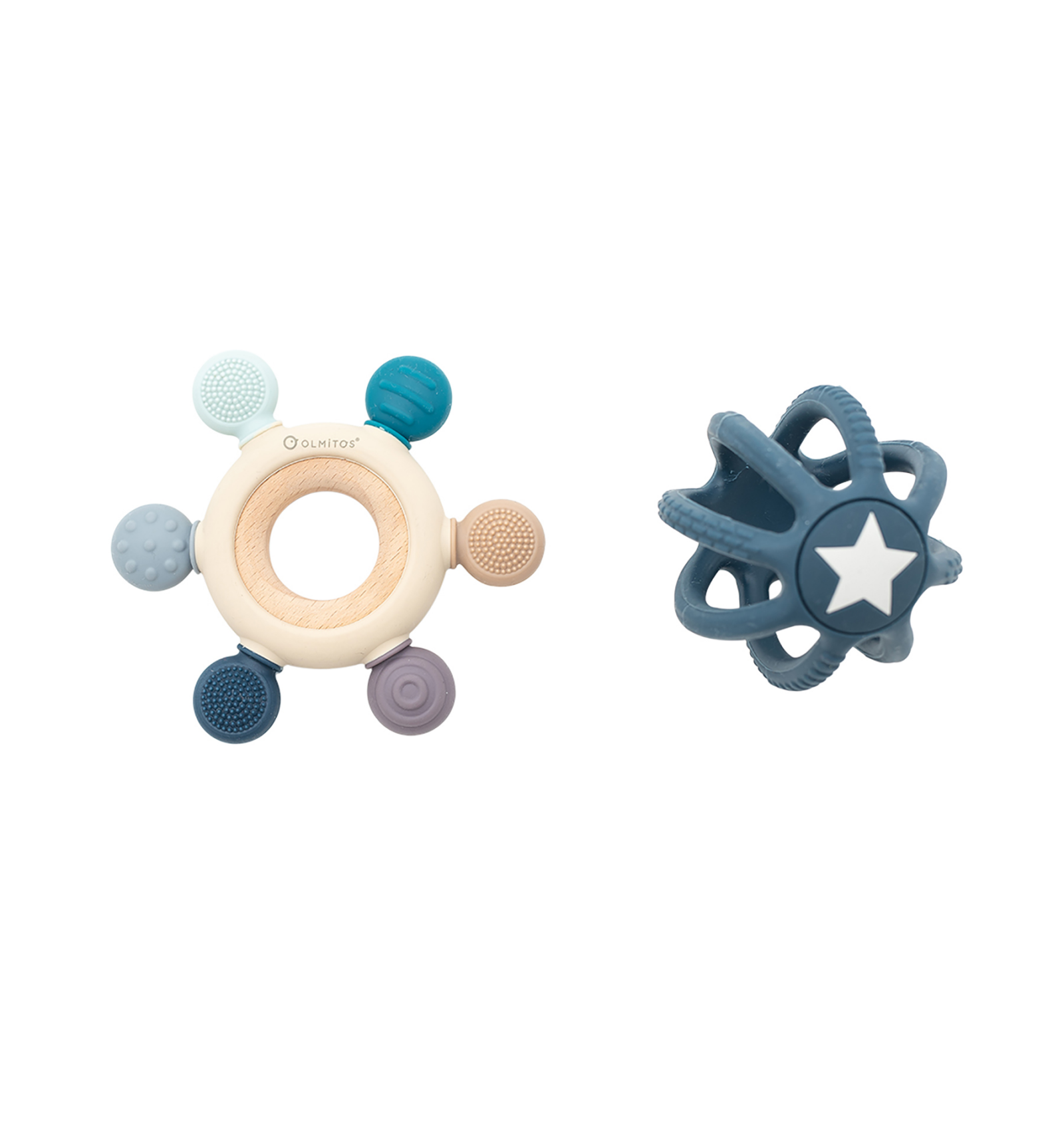 Este pack de 2 mordedores sensoriales de Olmitos ha sido cuidadosamente diseñado para acompañar al bebé en su etapa de dentición, ofreciendo una experiencia segura y estimulante.