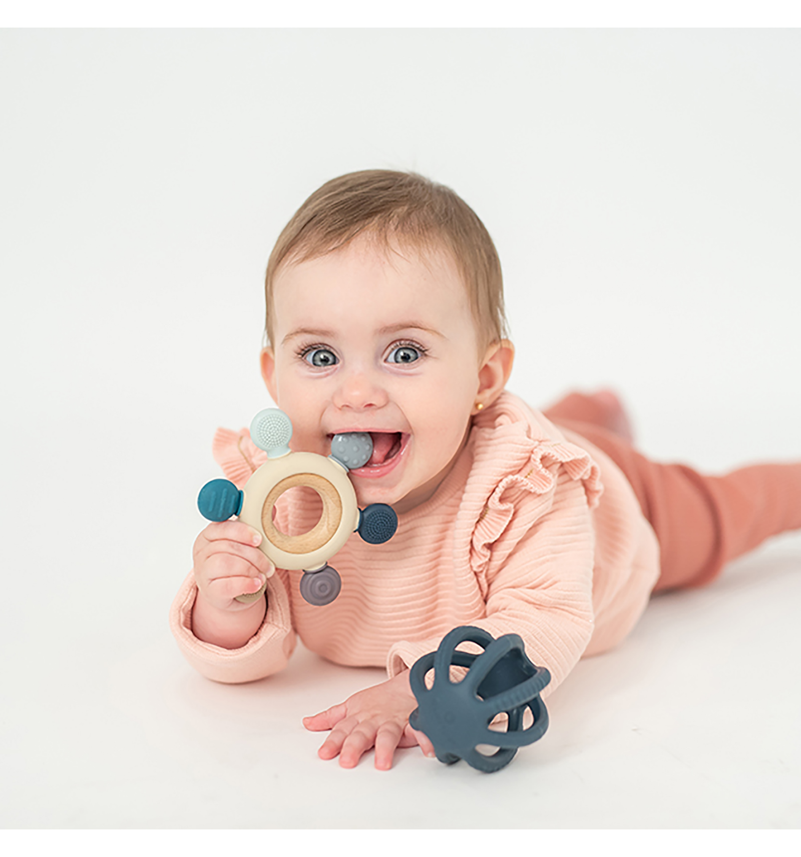 Fabricados en silicona alimentaria de grado LFGB y madera de haya natural, estos mordedores combinan suavidad y firmeza para calmar las encías sensibles. Sus líneas suaves, texturas variadas y diseño ergonómico están pensados para que el bebé los agarre fácilmente, favoreciendo el desarrollo de la motricidad fina.
