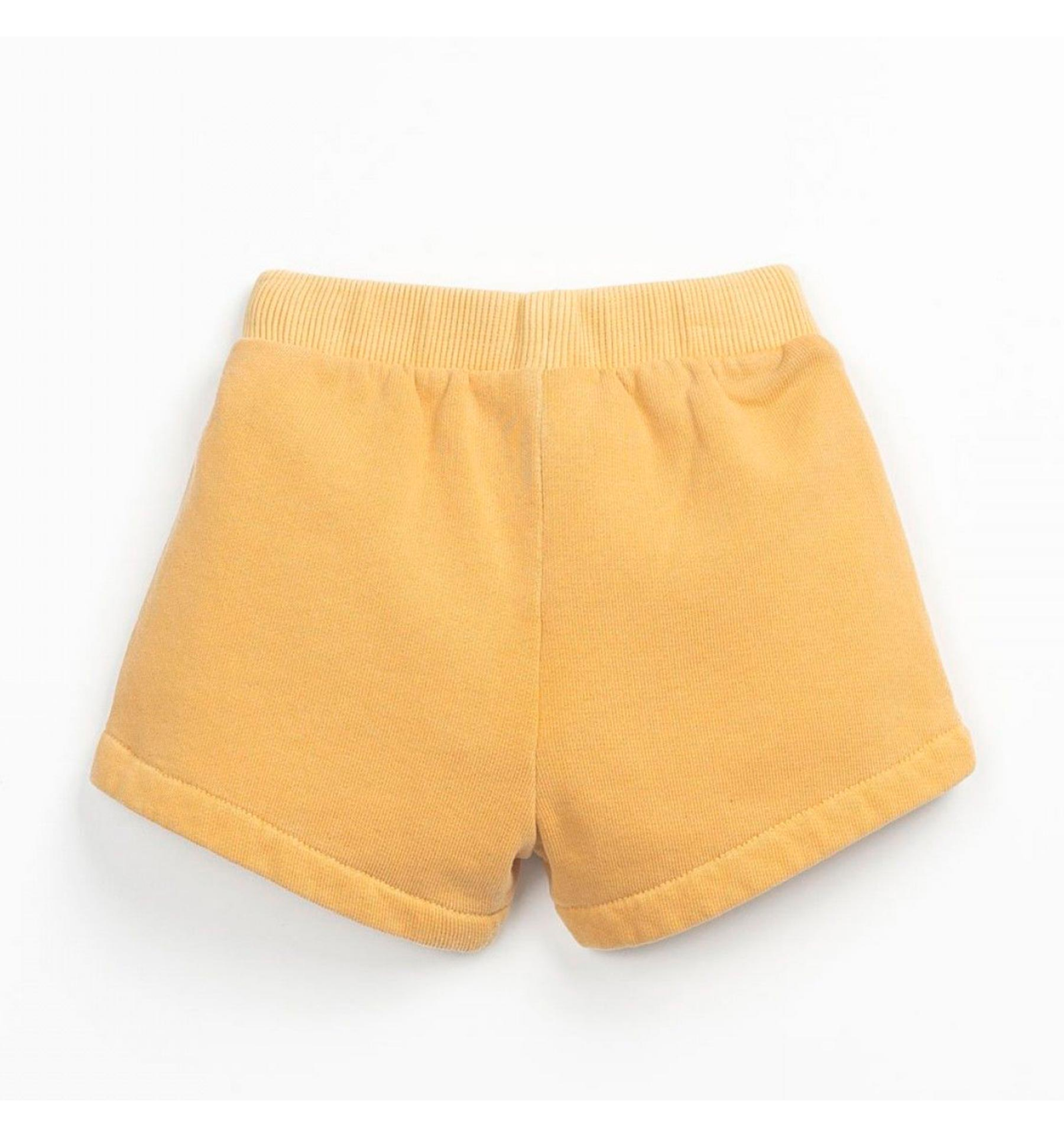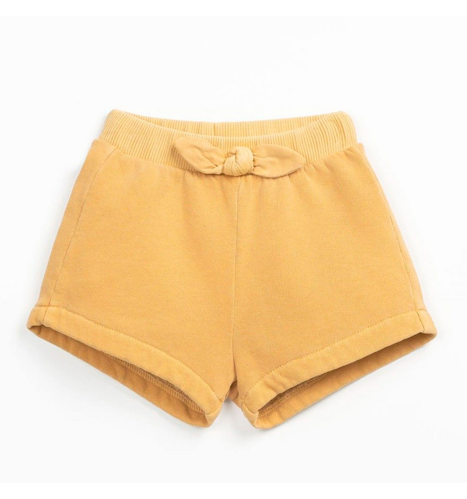 Este pantalón corto está confeccionado con punto mezcla de algodón orgánico y algodón, en color mostaza. Es un modelo con cintura elástica y lazo de adorno.