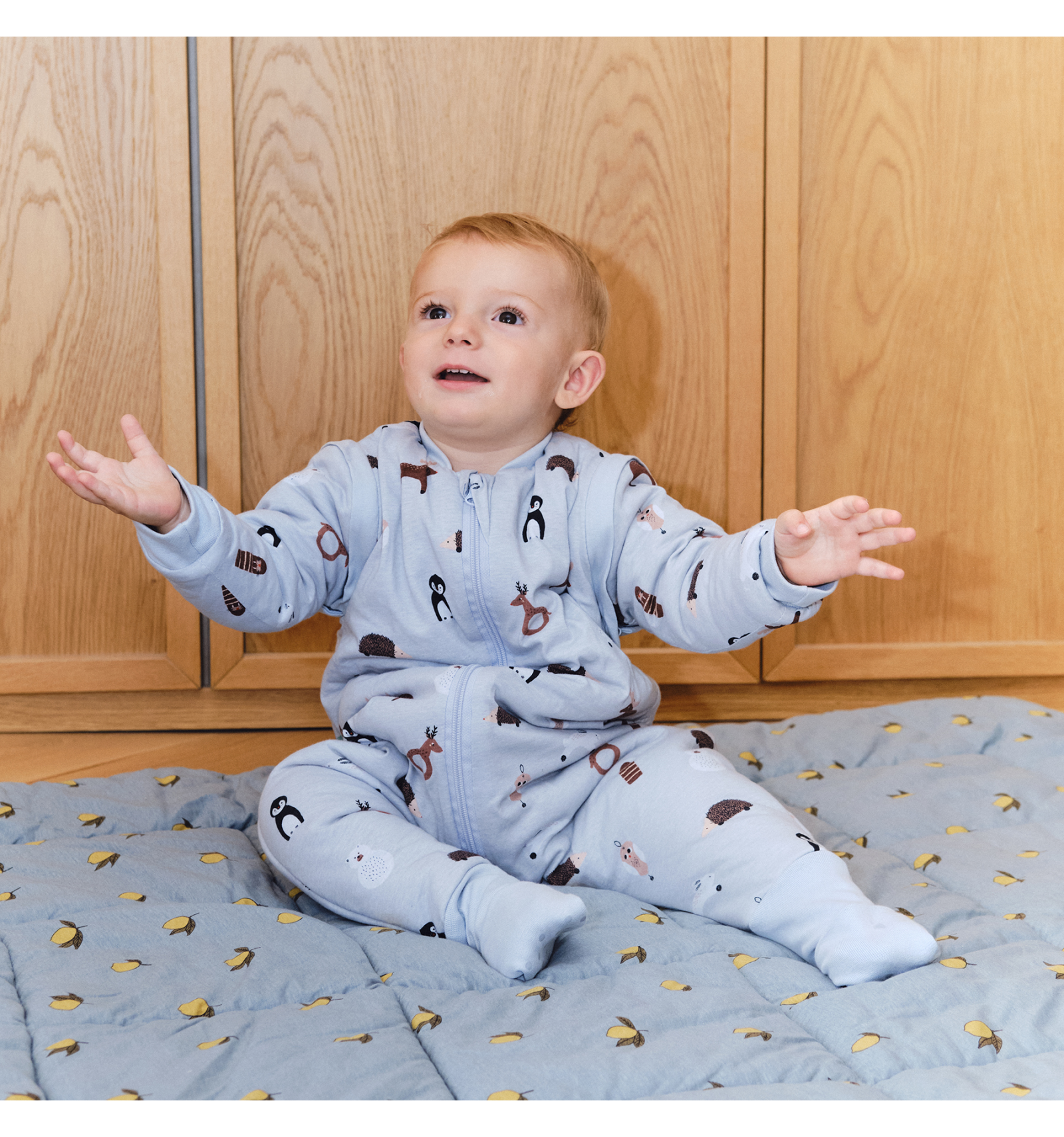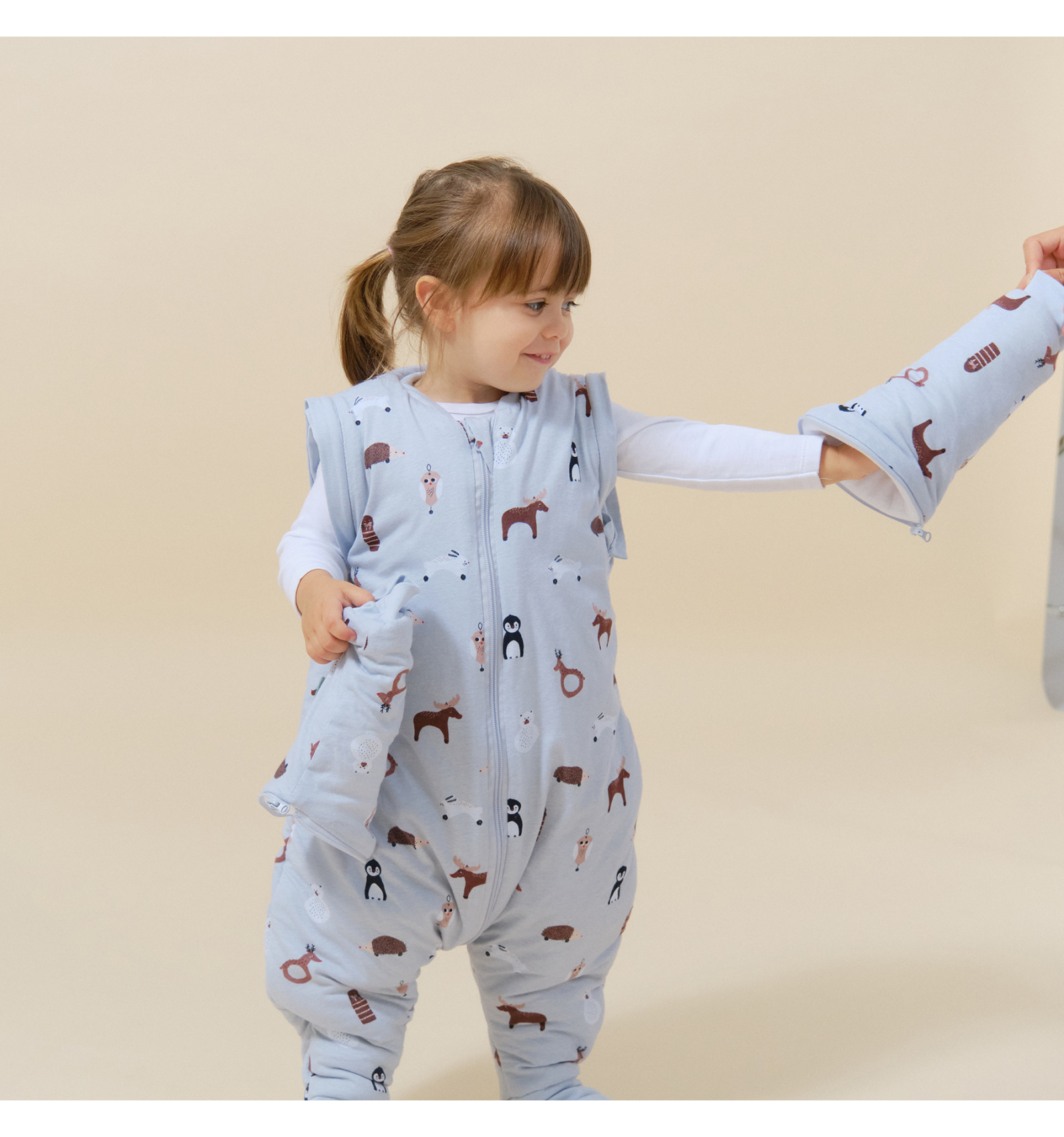 ¡Mangas y calcetines, todo en uno! El Pijama Manta de Invierno de Molis & Co mantiene a tu peque abrigado y cómodo mientras duerme o juega. Con calcetines antideslizantes extraíbles y mangas con cremallera, permite total libertad de movimiento. Fabricado con algodón Better Cotton y materiales reciclados. Ideal para habitaciones de hasta 21 °C.