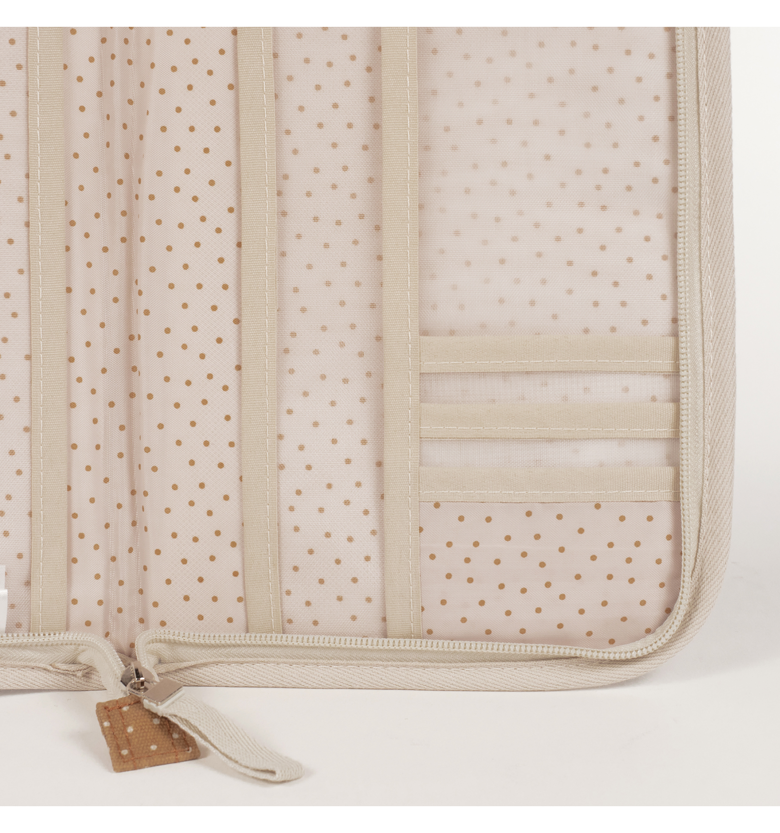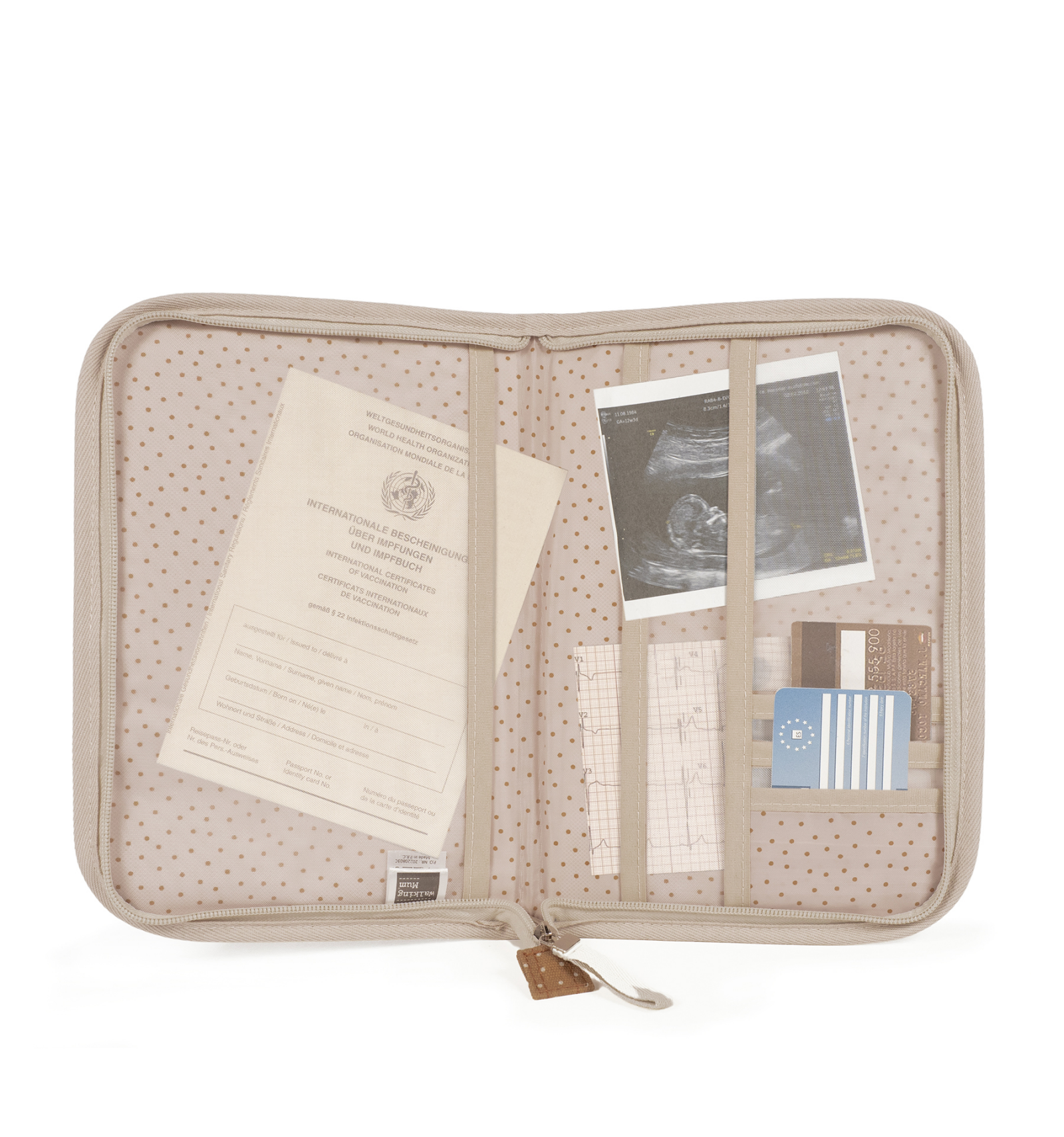 Esta carpeta portadocumentos ofrece múltiples bolsillos interiores distribuidos a ambos lados, ideales para guardar el libro de salud, las vacunas, las recetas médicas y cualquier documento importante relacionado con tu bebé. Su cierre de cremallera garantiza la seguridad y protección de los documentos en todo momento.