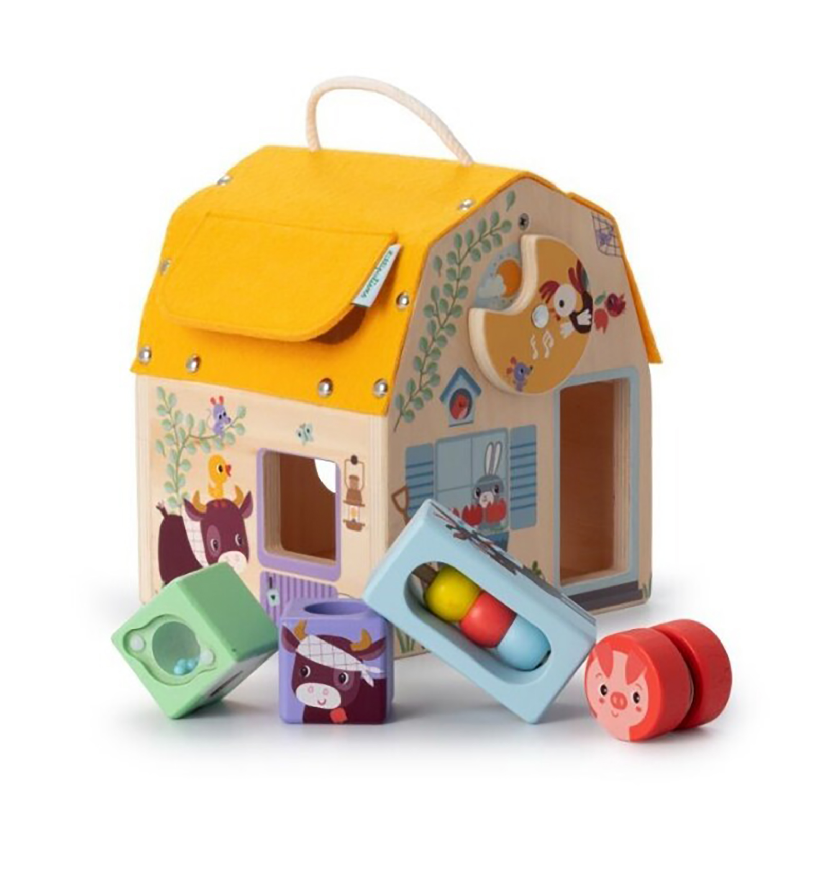 Casa sonora inspirada en los animales de la granja. Ayuda a estos animalitos a entrar y salir de su casa por las diferentes formas y colores que posee. ¡Cada animal tiene una forma y un sonido diferente, descúbrelo!
