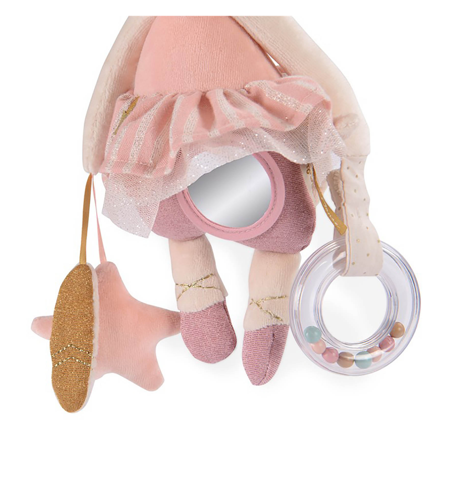 Entre sus encantadoras sorpresas se encuentran un aro de bolas, una estrella, una hoja con sonido de papel arrugado y un espejo escondido bajo el tutú del ratón. Su colgador permite colocarlo fácilmente en el cochecito, la cuna o el parque, acompañando al bebé en todas sus aventuras.
