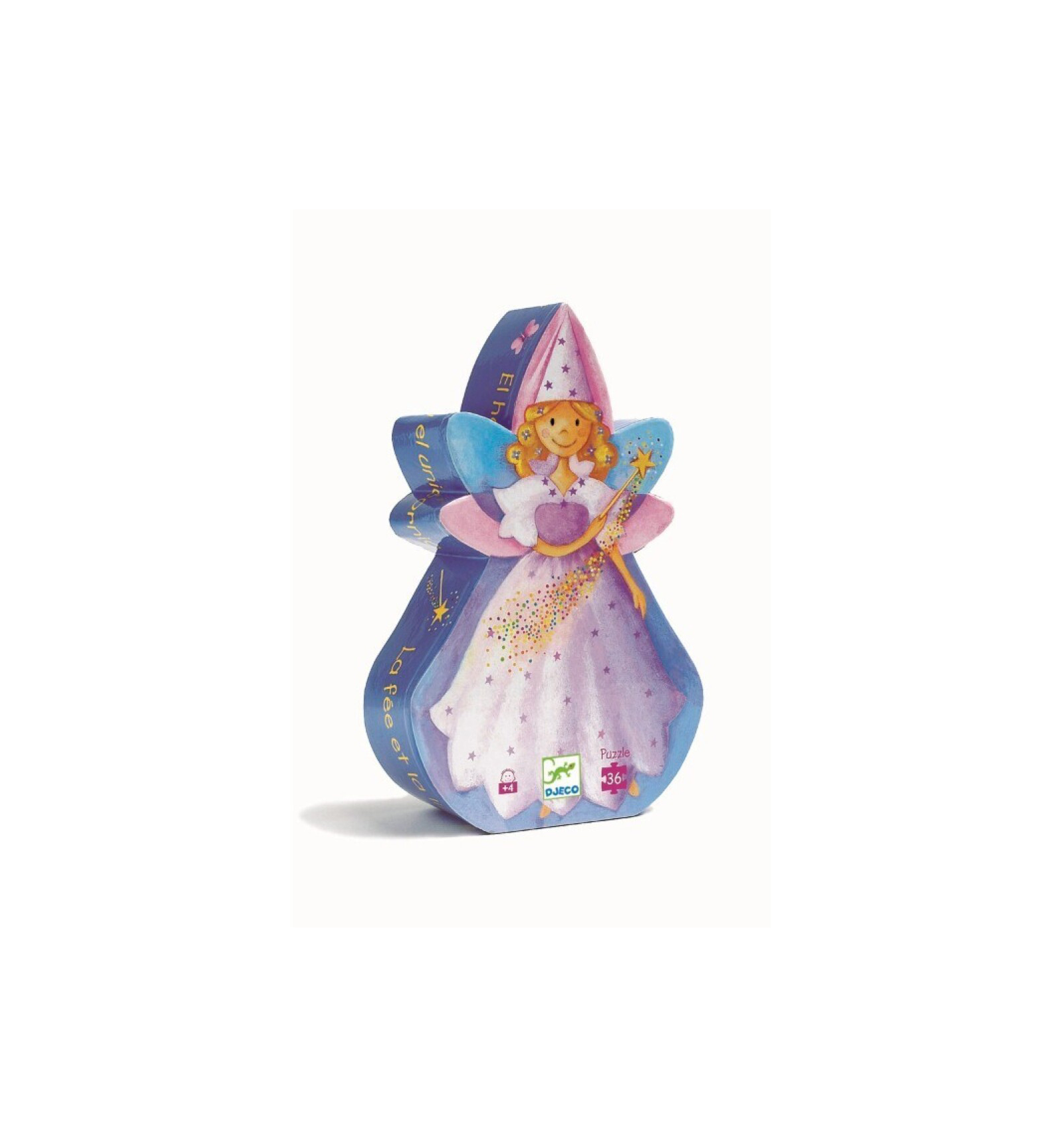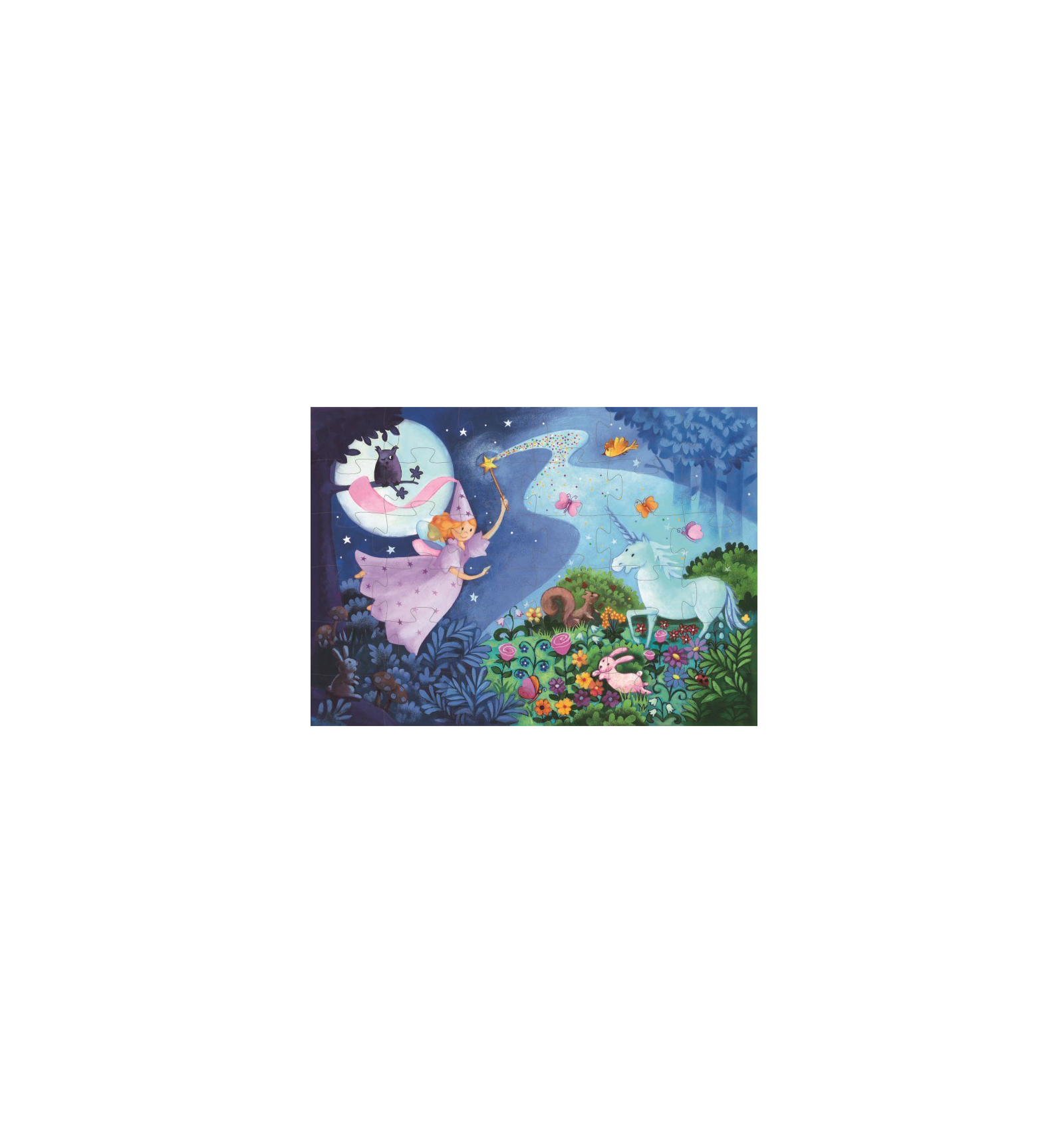 Puzle Djeco de 36 piezas con una encantadora ilustración de hadas y unicornios. Incluye una preciosa caja con silueta de hada madrina, ideal como elemento decorativo.