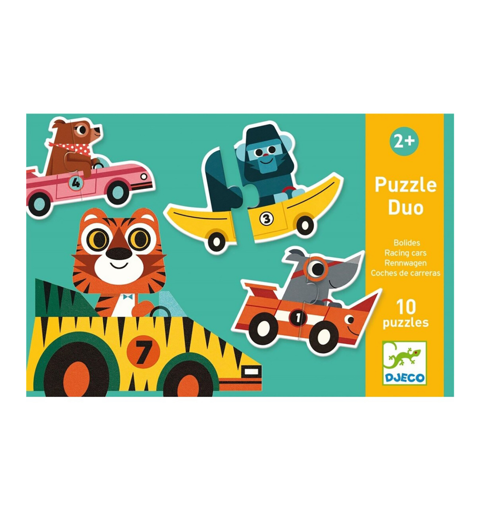 Set de 10 puzles de 2 piezas con coches de carreras pilotados por simpáticos animales. Ideal para niños a partir de 2 años.