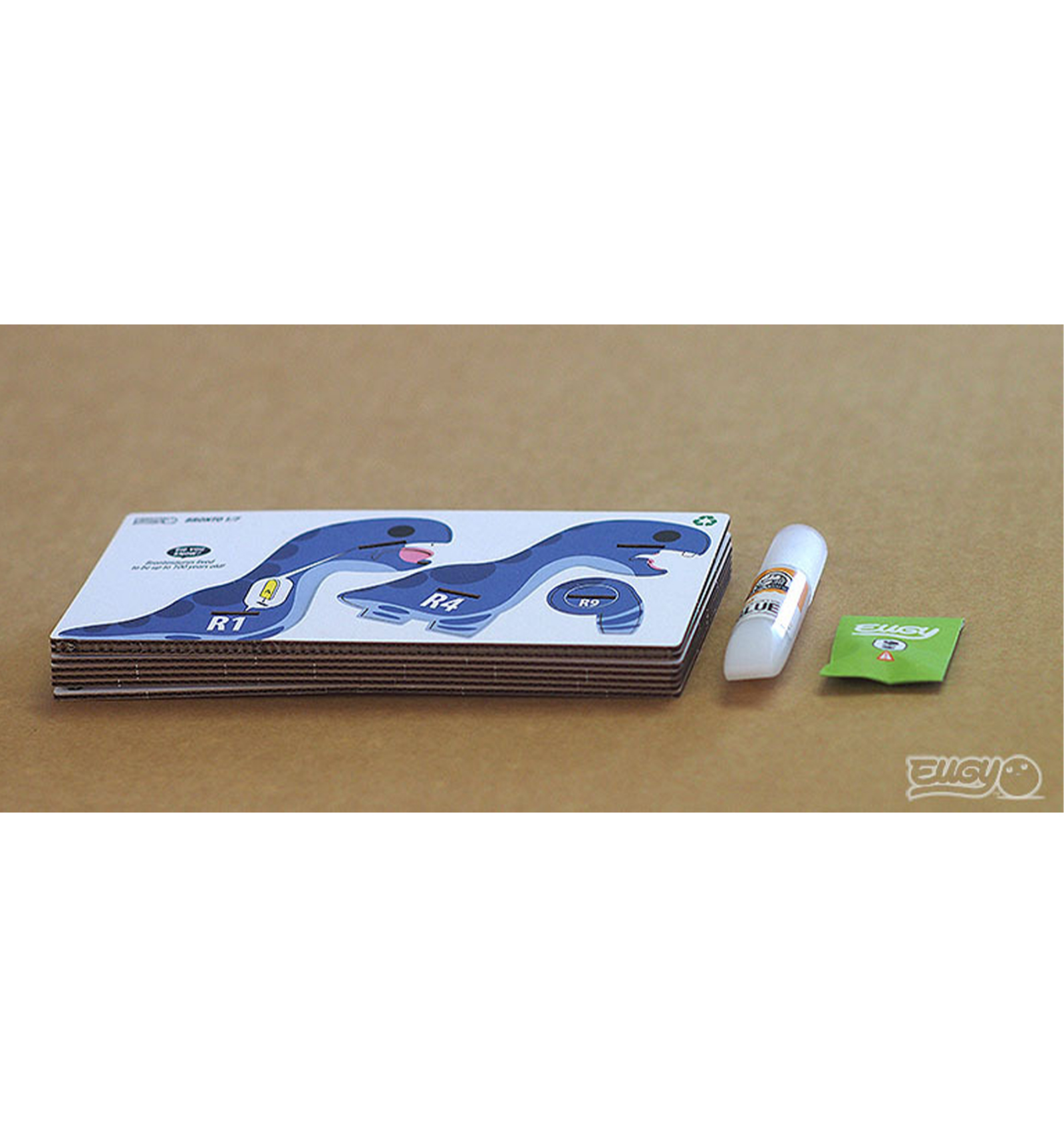 Está hecho de material reciclado, tanto el cartón como la tinta ecológica, que es no tóxica y a base de arroz. Además, no viene envuelto en plástico. Y el pegamento, que viene incluído, es orgánico y no tóxico.