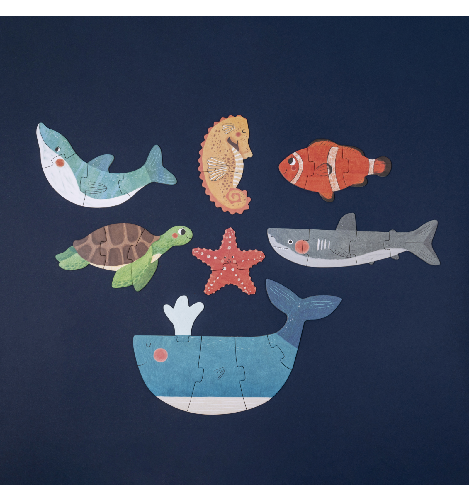 Este set incluye 7 puzzles progresivos y reversibles, con figuras de 2, 3, 4 y 5 piezas, pensados especialmente como primer puzzle infantil. En una cara se representan los animales marinos y, en el reverso, sus crías, añadiendo un componente tierno y sorprendente que amplía las posibilidades de juego.