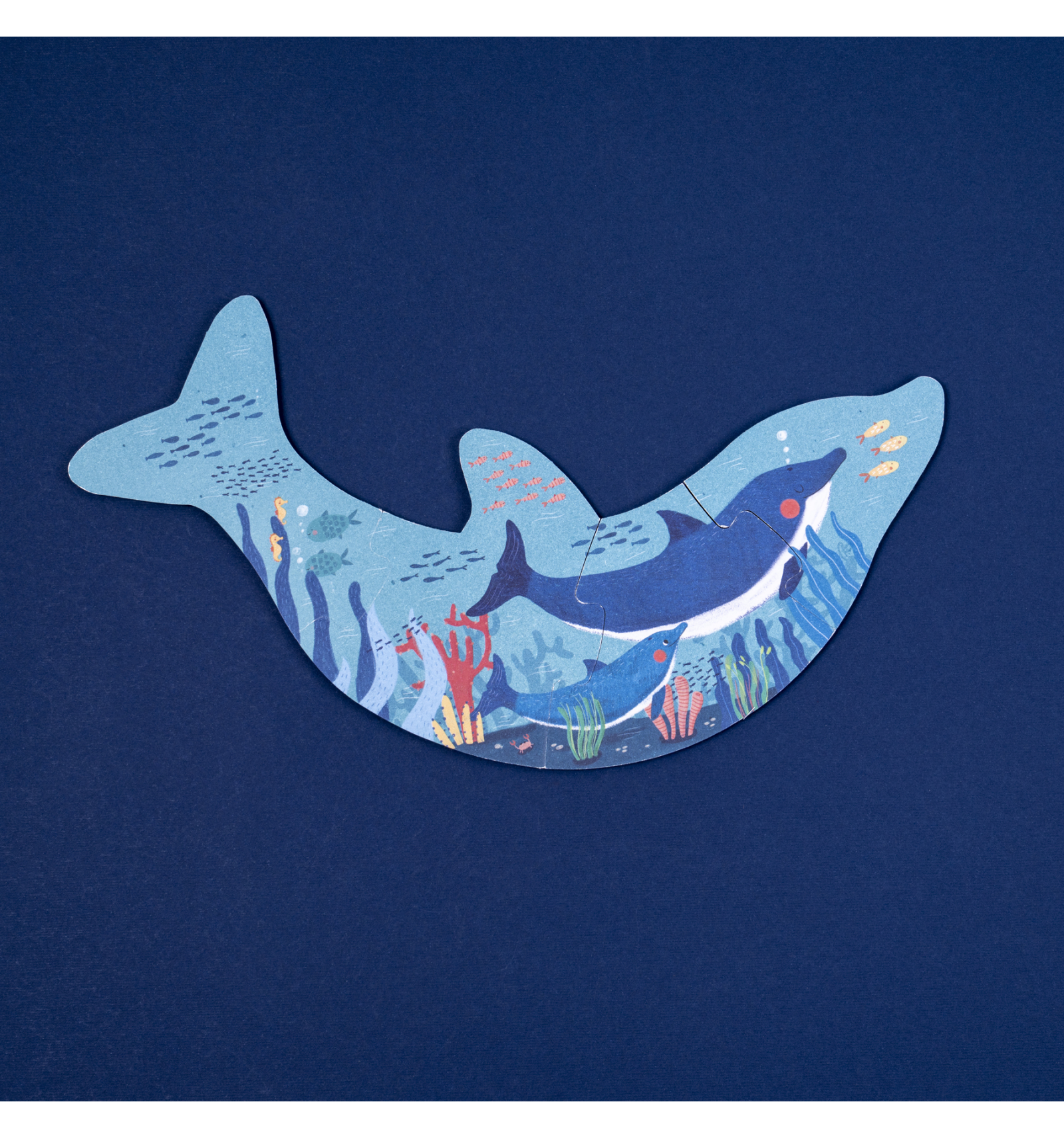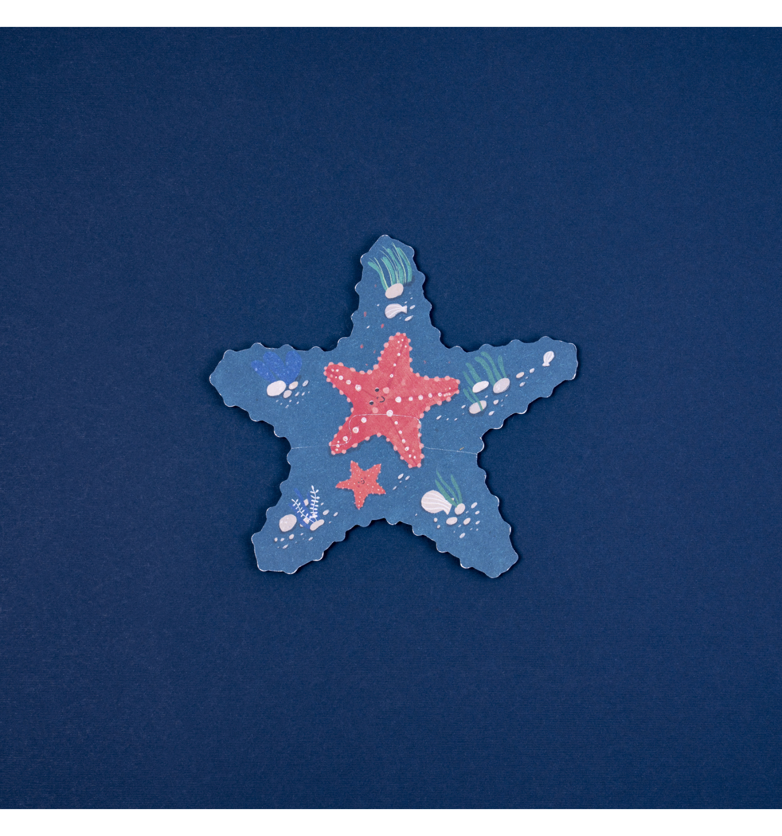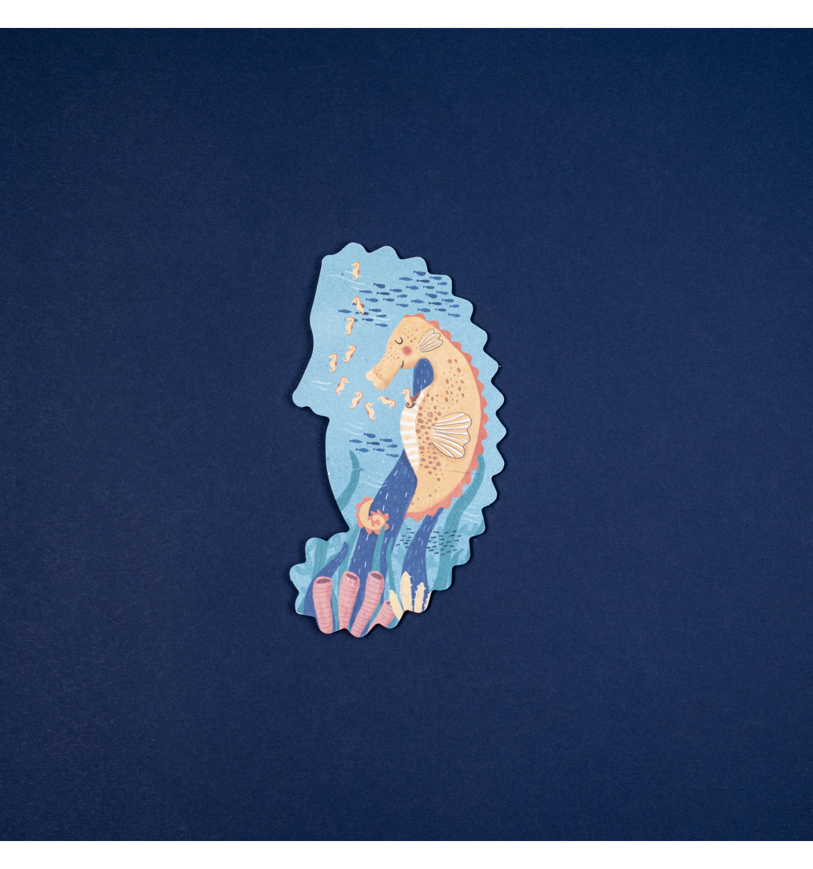 Puzzle Blue de Londji invita a sumergirse en el fondo del mar a través de un juego tranquilo, colorido y educativo. Entre olas suaves y un universo submarino mágico, los niños y niñas conocerán a la estrella de mar, el caballito de mar, el delfín, el tiburón, el pez payaso y la gran ballena.