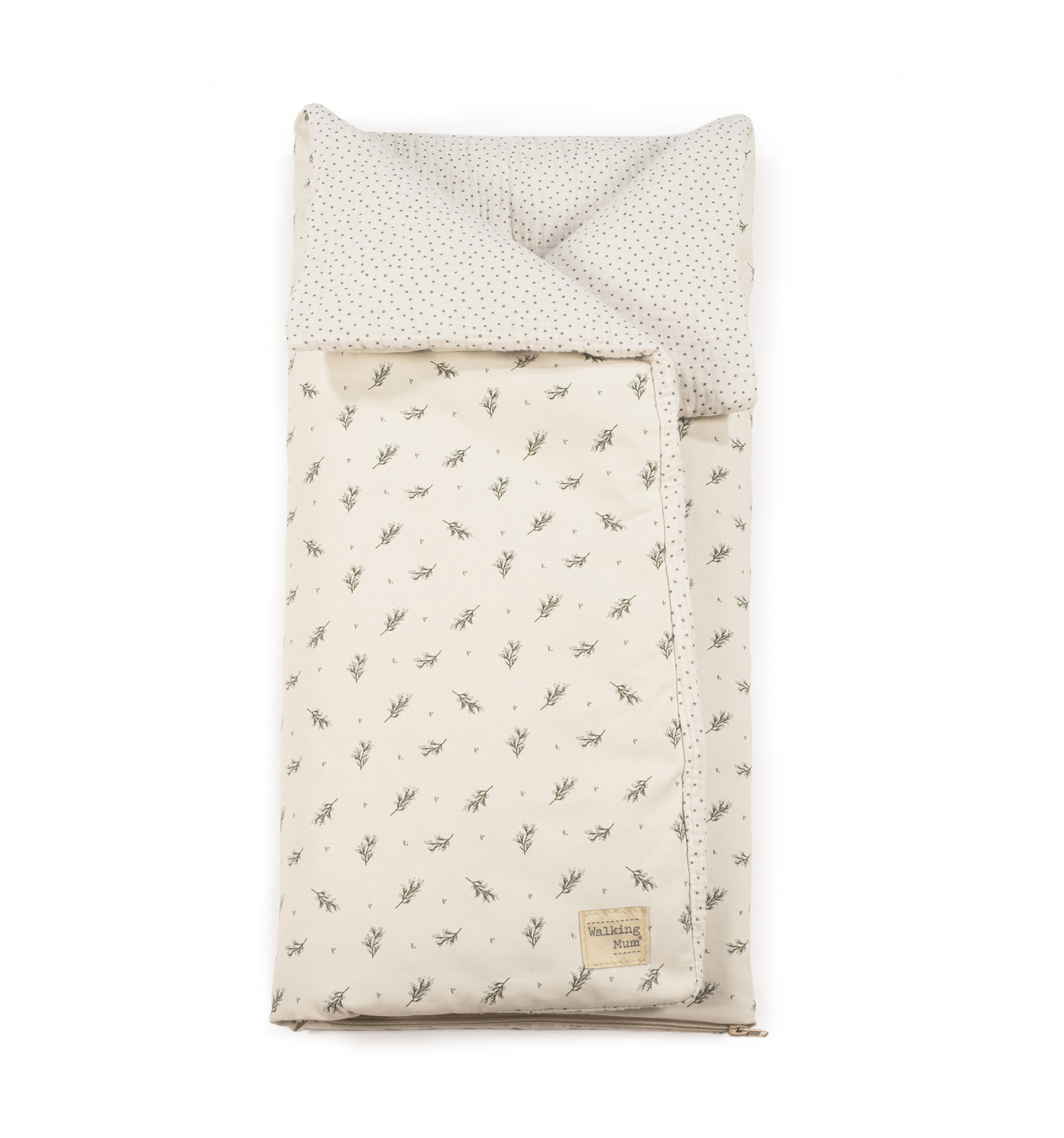Saco arrullo Mimosa Verde de Walking Mum, confeccionado en suave muselina 100% algodón. Ideal para los primeros días del bebé y paseos en capazo. Convertible en manta para cuna, con cierre de velcro y cremallera para mantener al peque siempre abrigado.