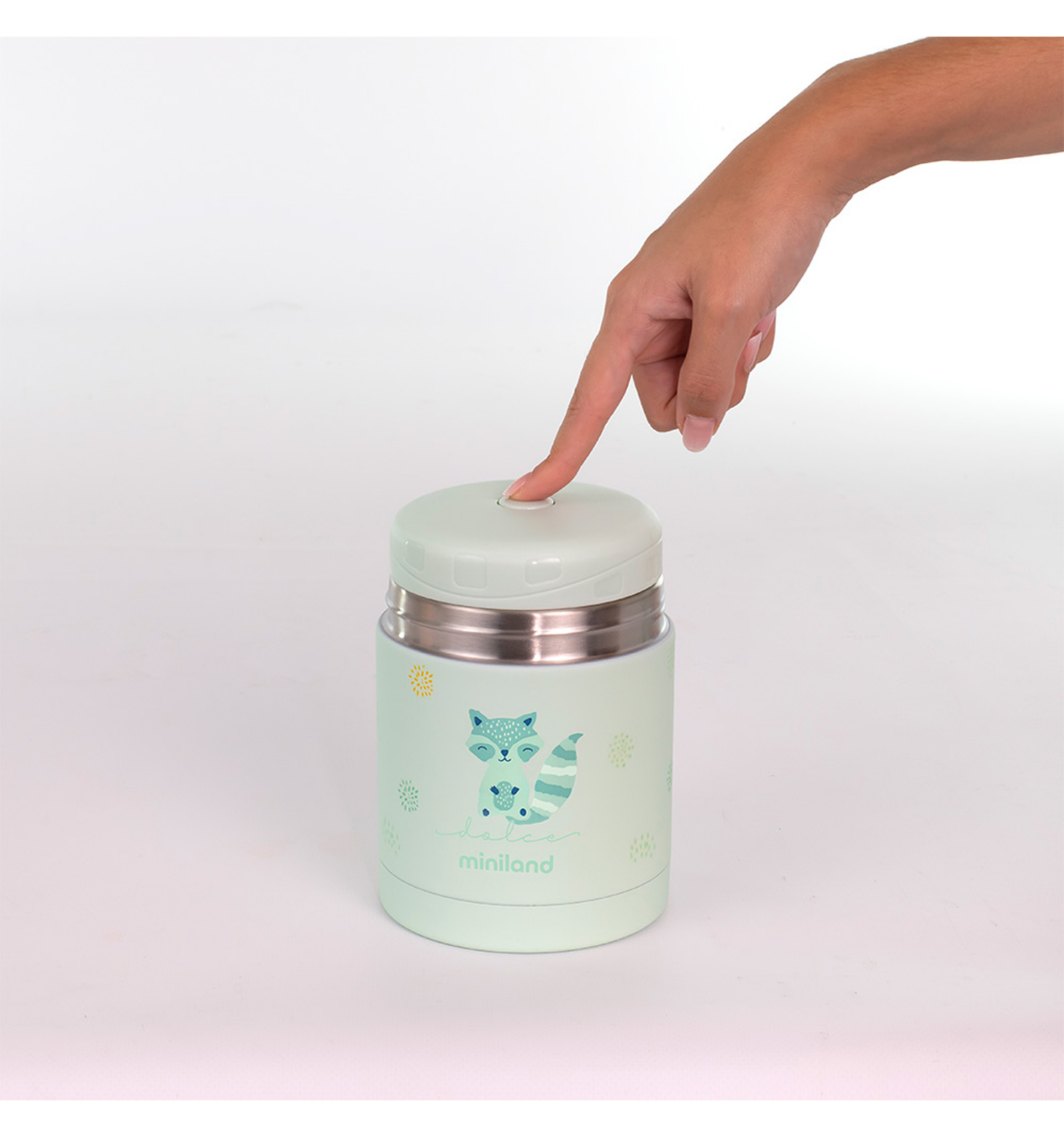 El diseño del Food Thermy Mint incluye una válvula de seguridad que evita derrames accidentales y una doble tapa de rosca para asegurar un transporte higiénico. Su tamaño compacto lo hace fácil de llevar a cualquier lugar y, gracias a su capacidad, puedes dar la comida directamente desde el recipiente sin necesidad de verterla en otro plato.