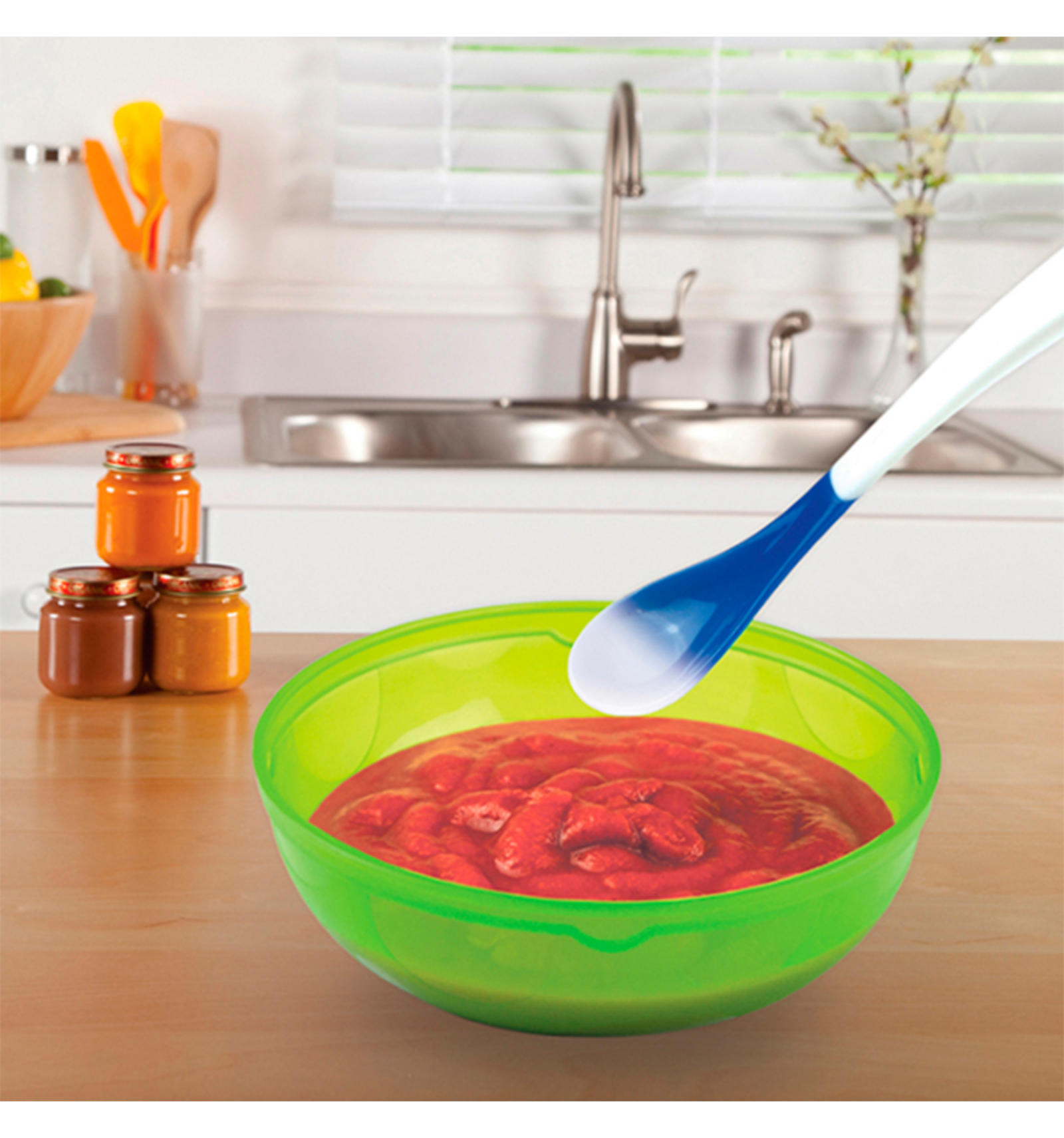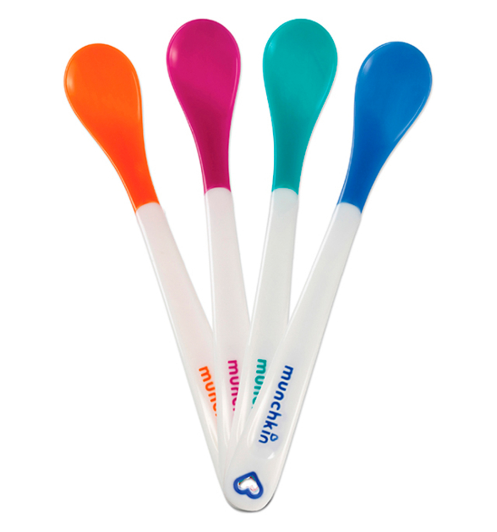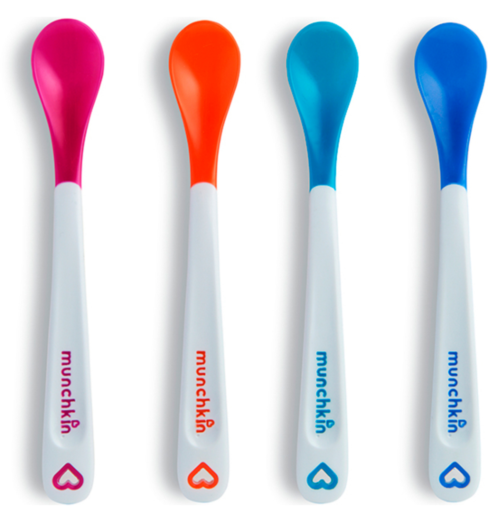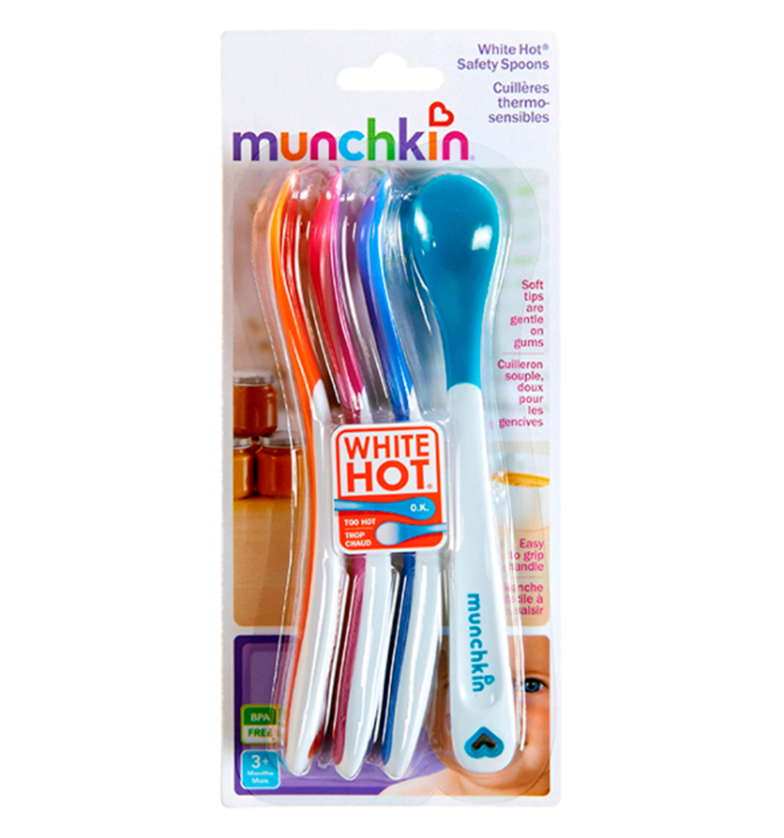 Pack de 4 cucharas termosensibles que te avisan si la comida está demasiado caliente. Un sistema patentado por Munchkin que hace que la cuchara se vuelva blanca cuando los alimentos superan los 43,3ºC. Con mango largo para dar de comer. Sin BPA ni ftalatos. Aptas para la bandeja superior de lavavajillas.