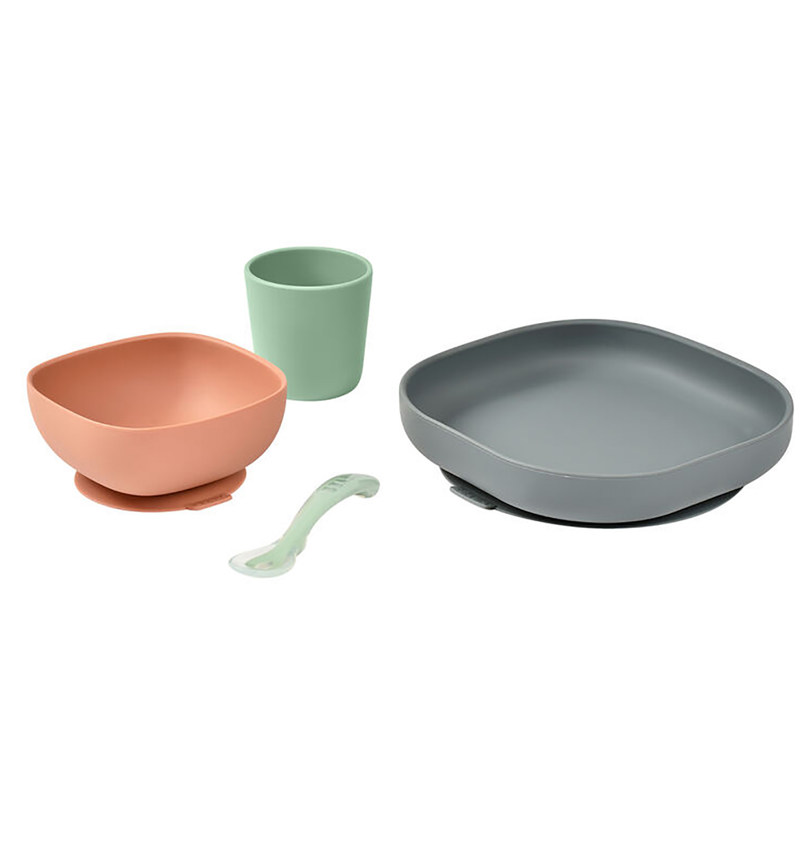 Vajilla infantil de silicona compuesta por un plato con ventosa, un bol con ventosa, un vaso y una cuchara para fijar los platos en la mesa y evitar incidentes.