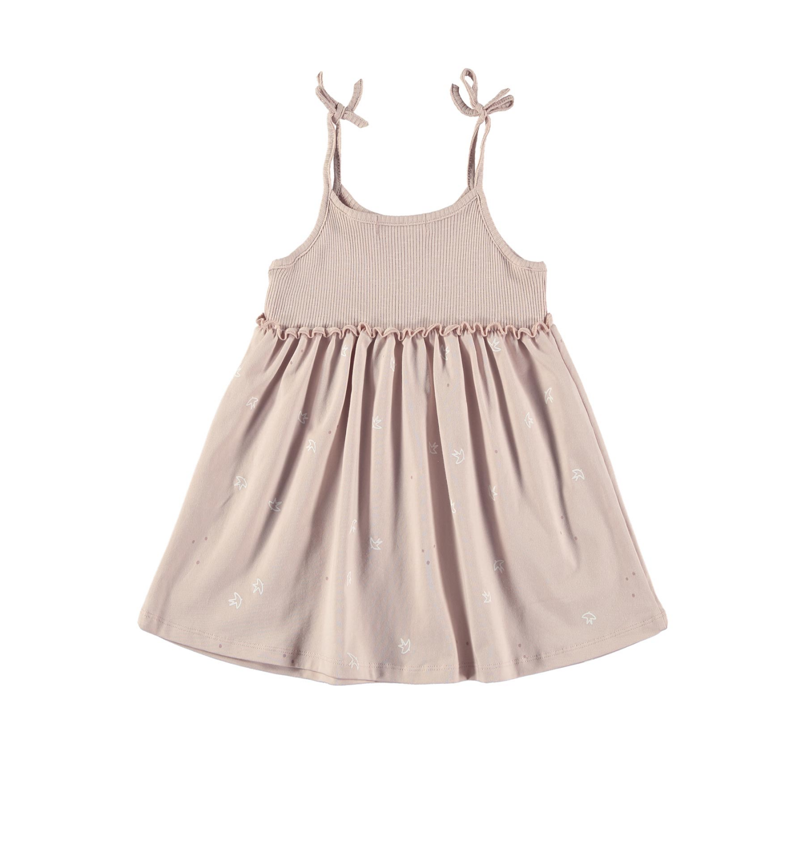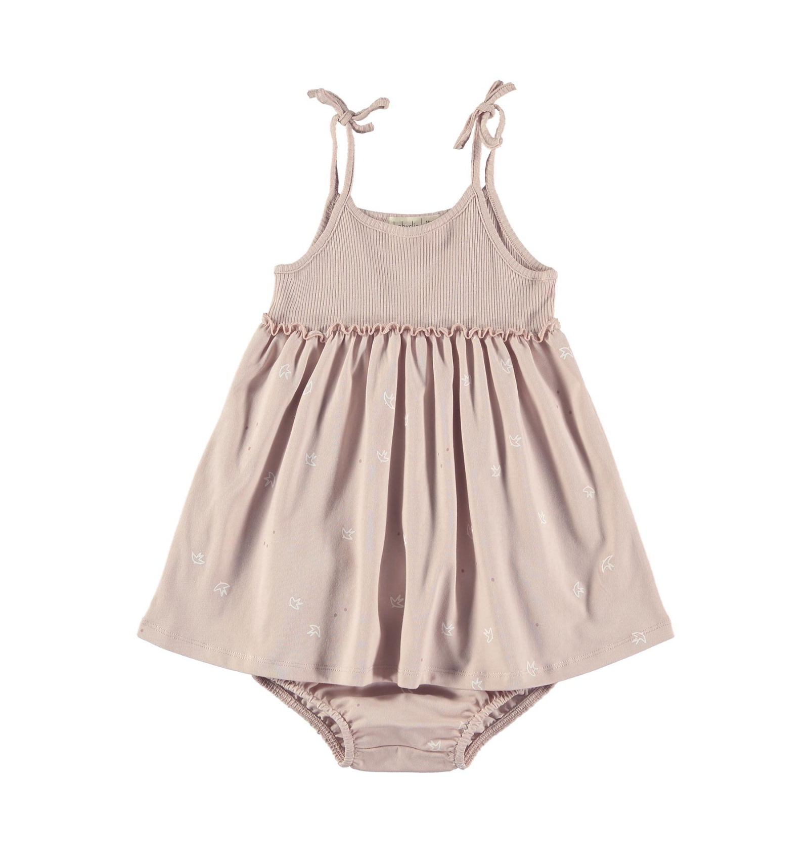 Vestido de tirantes con lazos en el hombro Babyclic, confeccionado de Rib flamé 95% algodón ORGÁNICO 5% elastano. Faldón de punto liso 100% algodón orgánico.