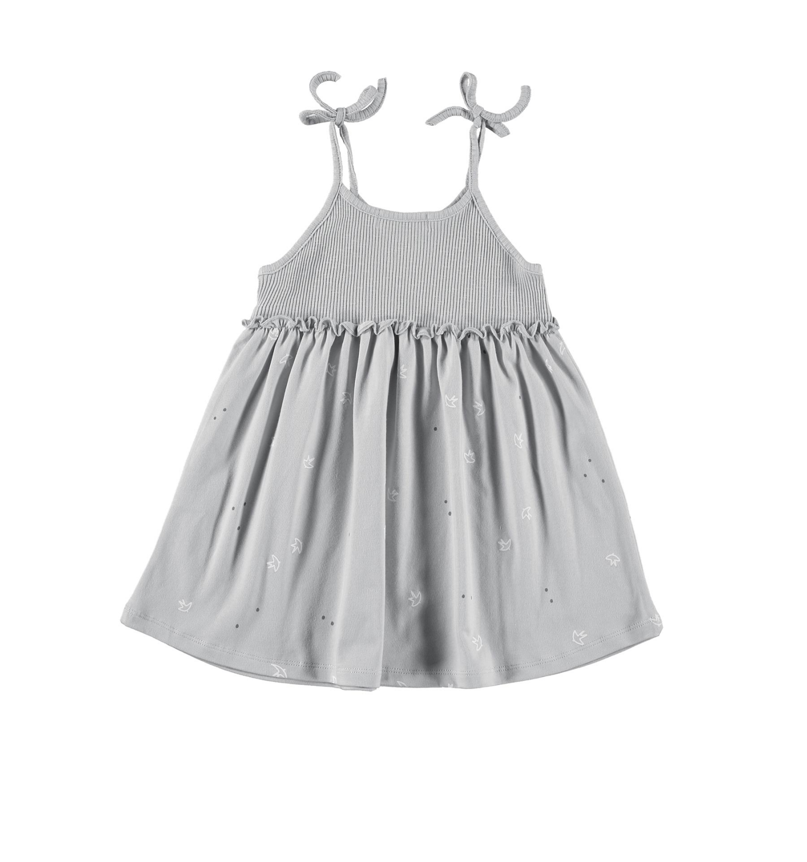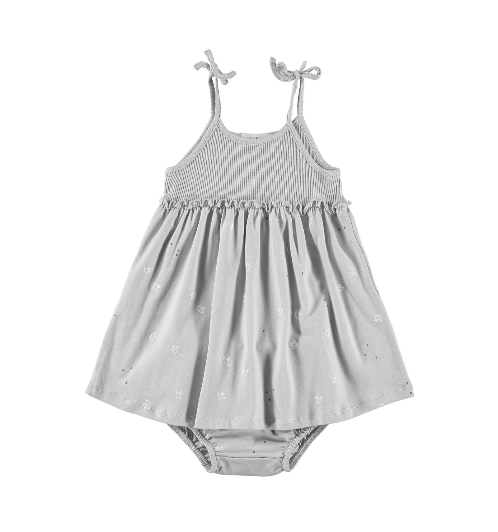 Vestido de tirantes con lazos en el hombro Babyclic, confeccionado de Rib flamé 95% algodón ORGÁNICO 5% elastano. Faldón de punto liso 100% algodón orgánico.