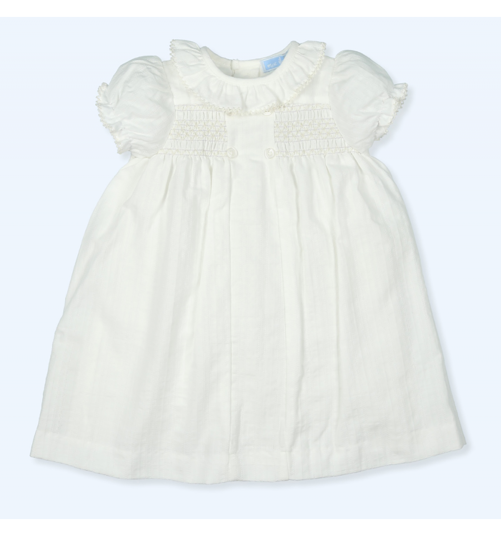 Vestido Mac Ilusión Smock color crudo en 100% algodón con forro interior. Diseño clásico con detalle en el cuello y botones traseros para fácil colocación.
